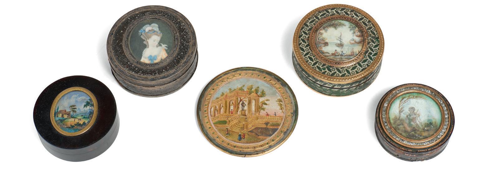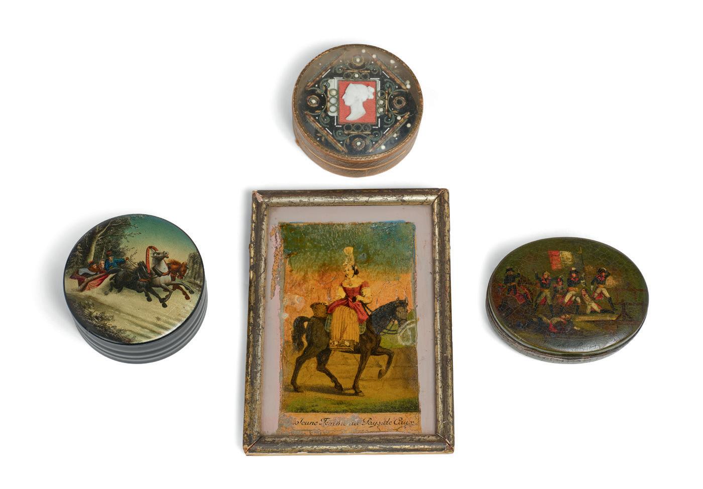 LOT DE QUATRE BOÎTES CIRCULAIRES en écaillle, les couvercles ornés de miniatures.