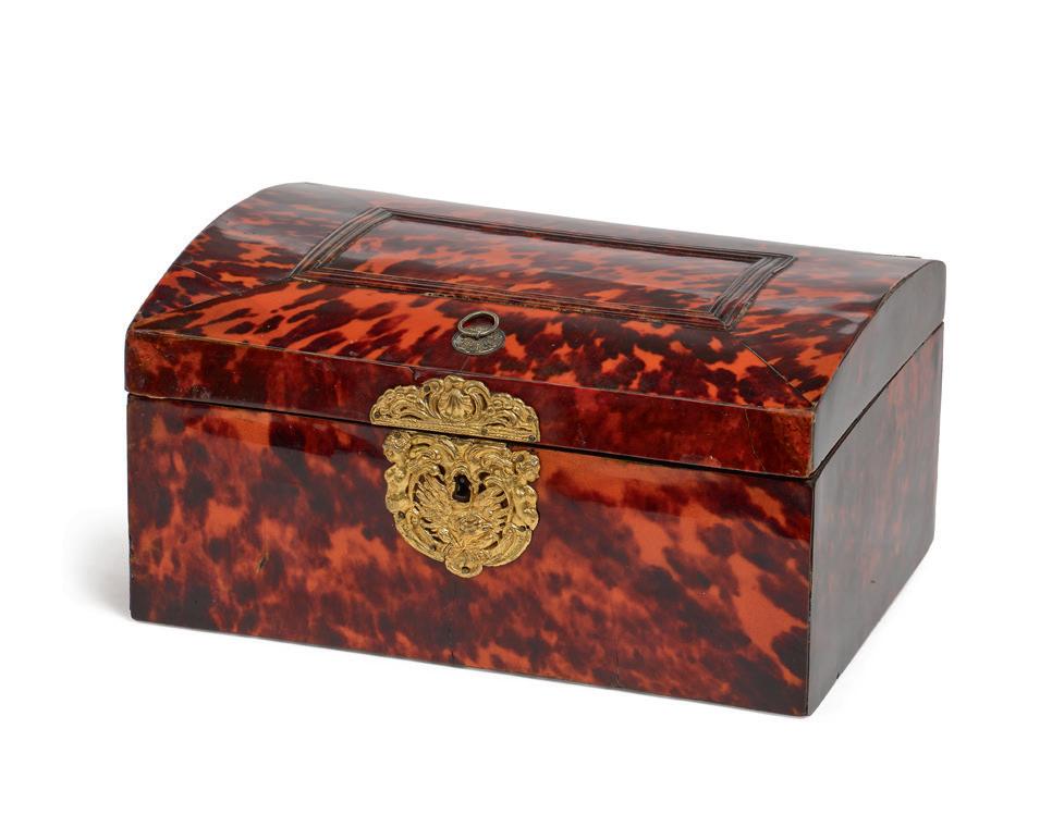 en corne teintée rouge à l’imitation de l’écaille, entrée de serrure et charnières en cuivre repoussé et doré à décor de fleurs et naïades. France, XVIIe siècle.