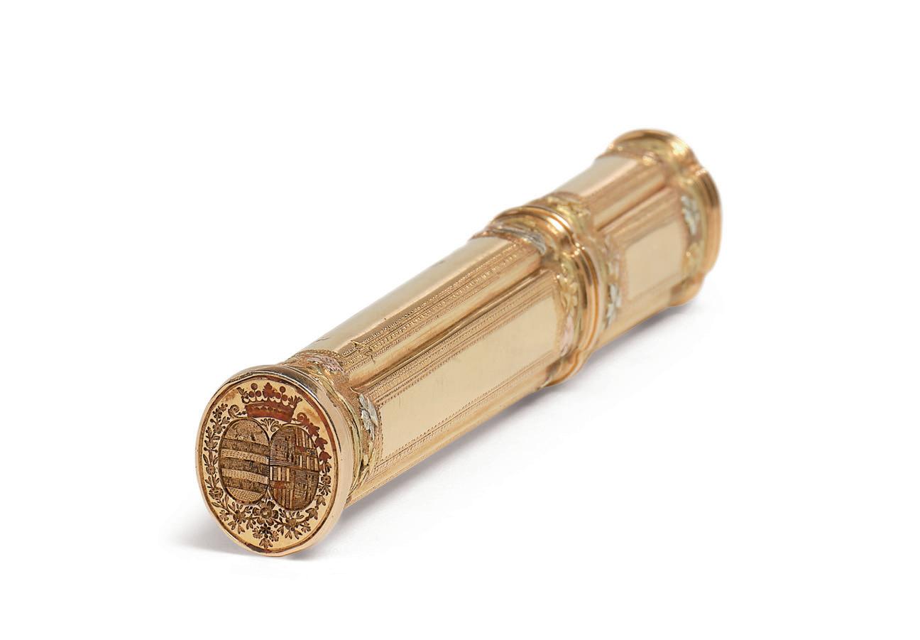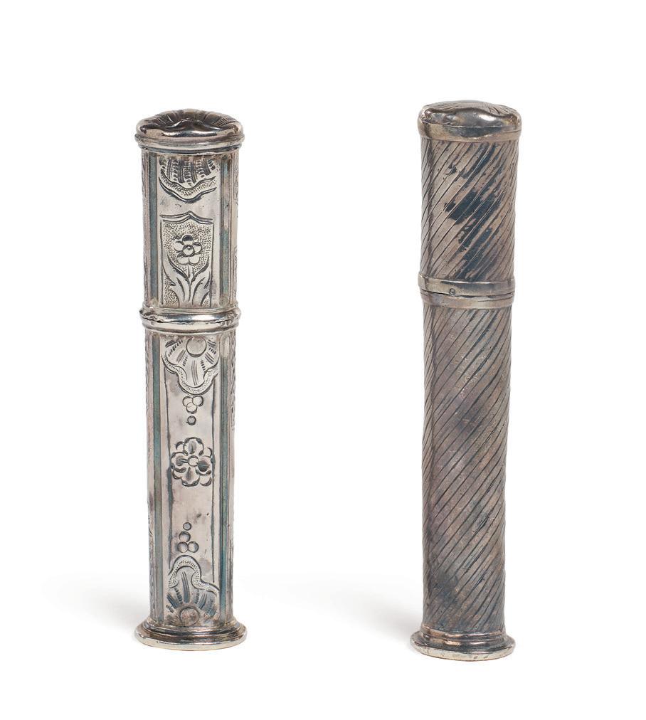en argent, l’un à décor torsadé (poinçon cygne), l’autre à décor de fleurs. Une matrice gravée d’un monograme sous couronne. Travail étranger fin XVIIIe, début du XIXe siècle.