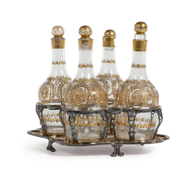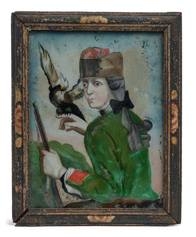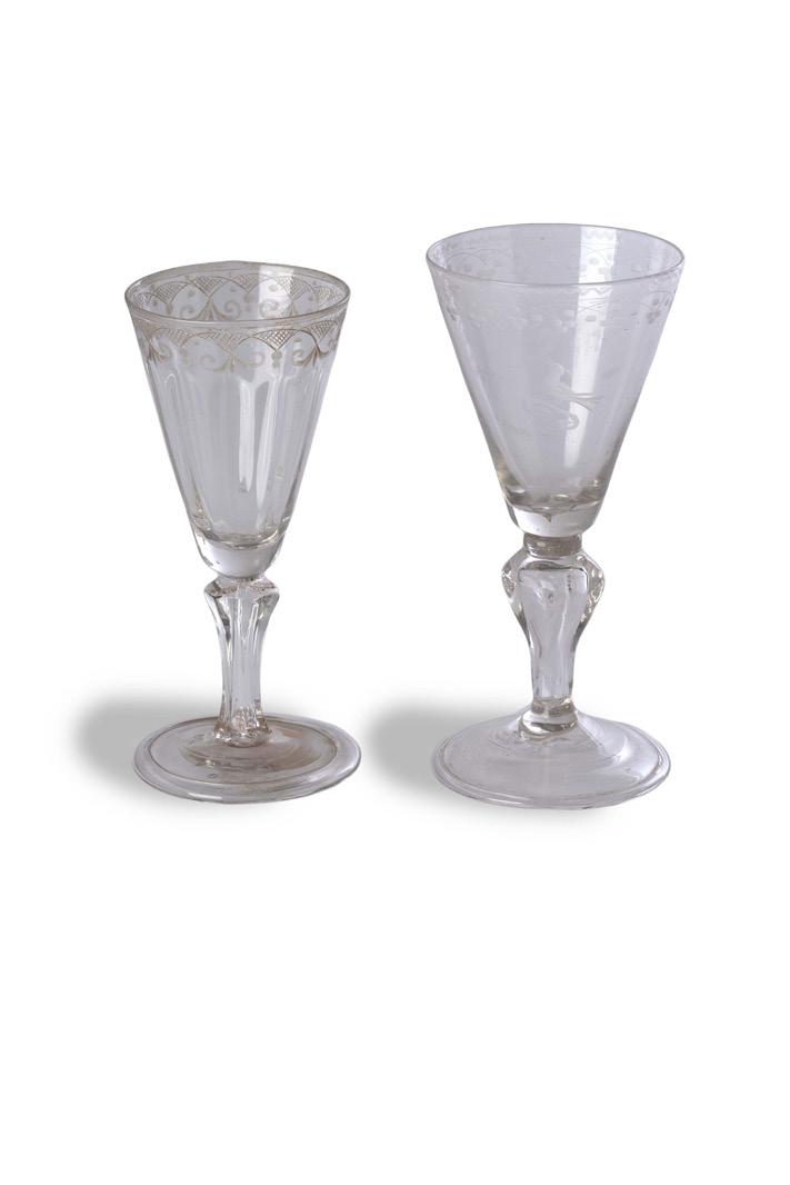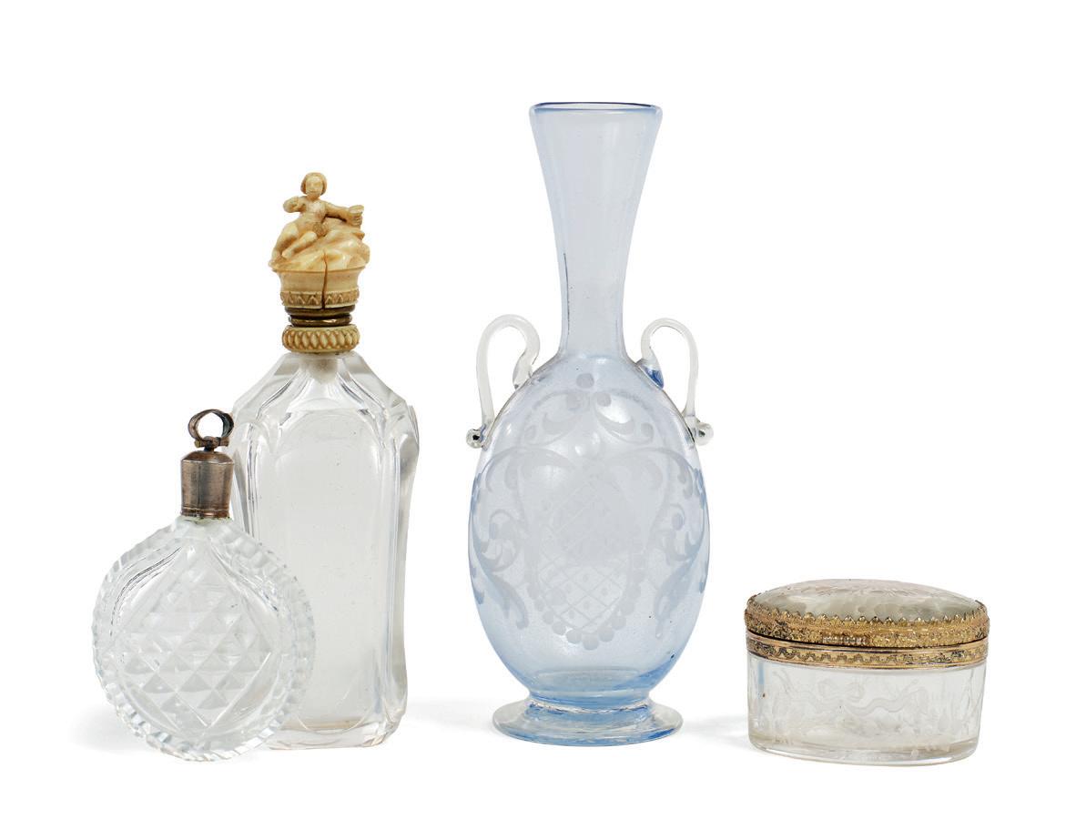 en verre taillé, une paire au portrait peint en fixé sous verre d’un homme et de son épouse. Une autre à décor d’un chasseur et son chien gravé à la roue au dessous, réhauts d’or et verre teinté rouge.