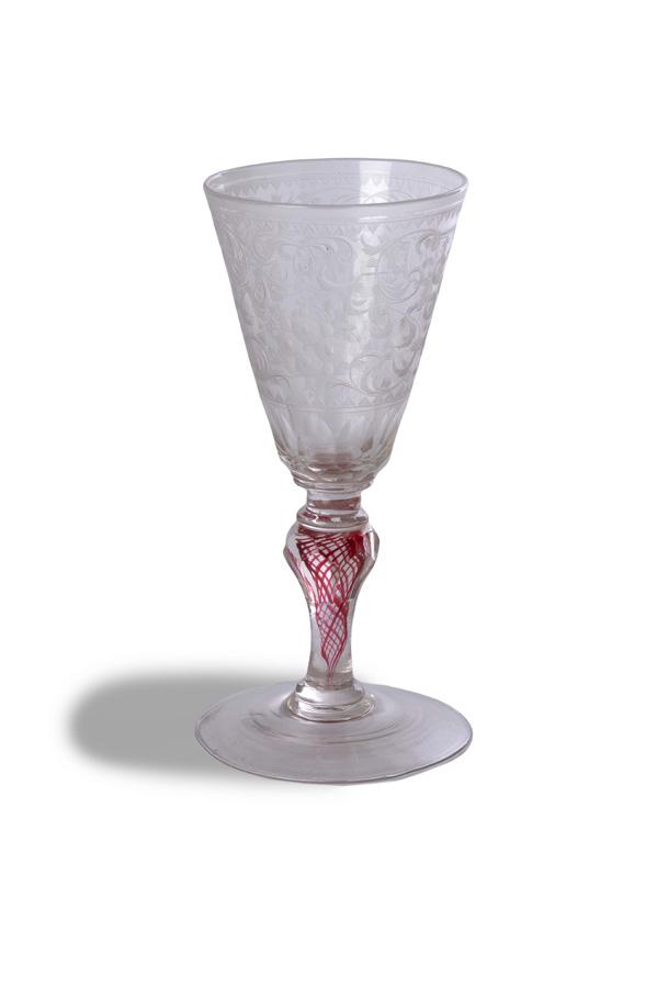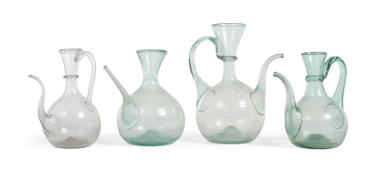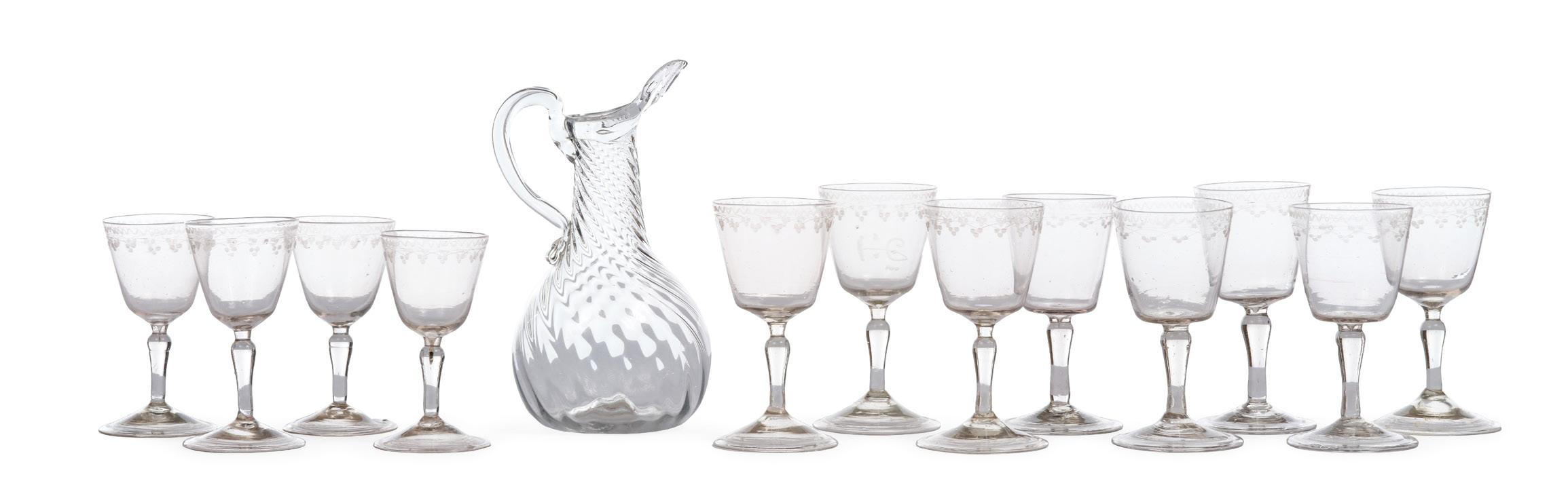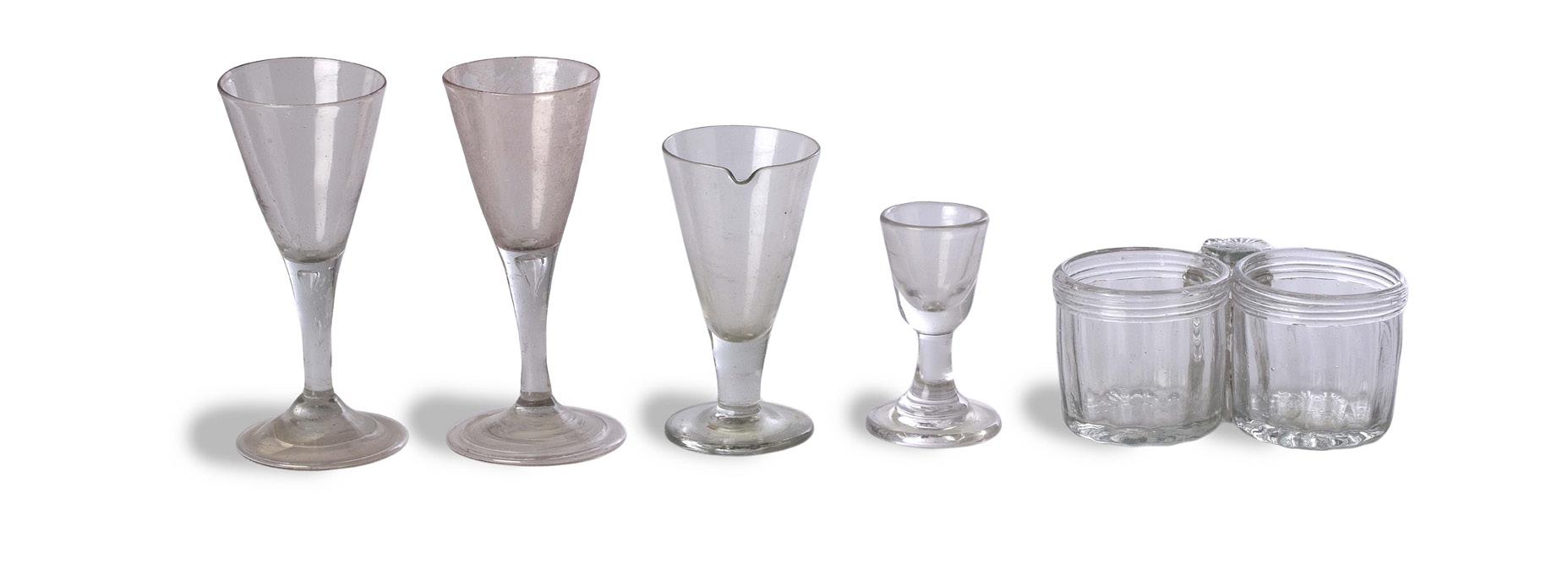en verre taillé, une paire au portrait peint en fixé sous verre d’un homme et de son épouse. Une autre à décor d’un chasseur et son chien gravé à la roue au dessous, réhauts d’or et verre teinté rouge.