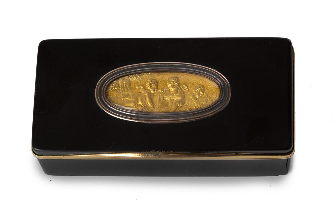 On y joint un couvercle en écaille et laiton doré, décoré d’un papier estampé et rehaussé représentant un motif architectural.