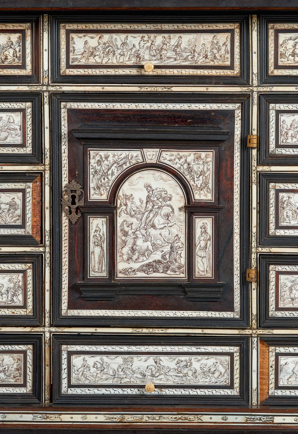Détail d’un cabinet de voyage en placage d’ébène et plaques d’ivoire marin finement gravé. Italie, XVII e siècle