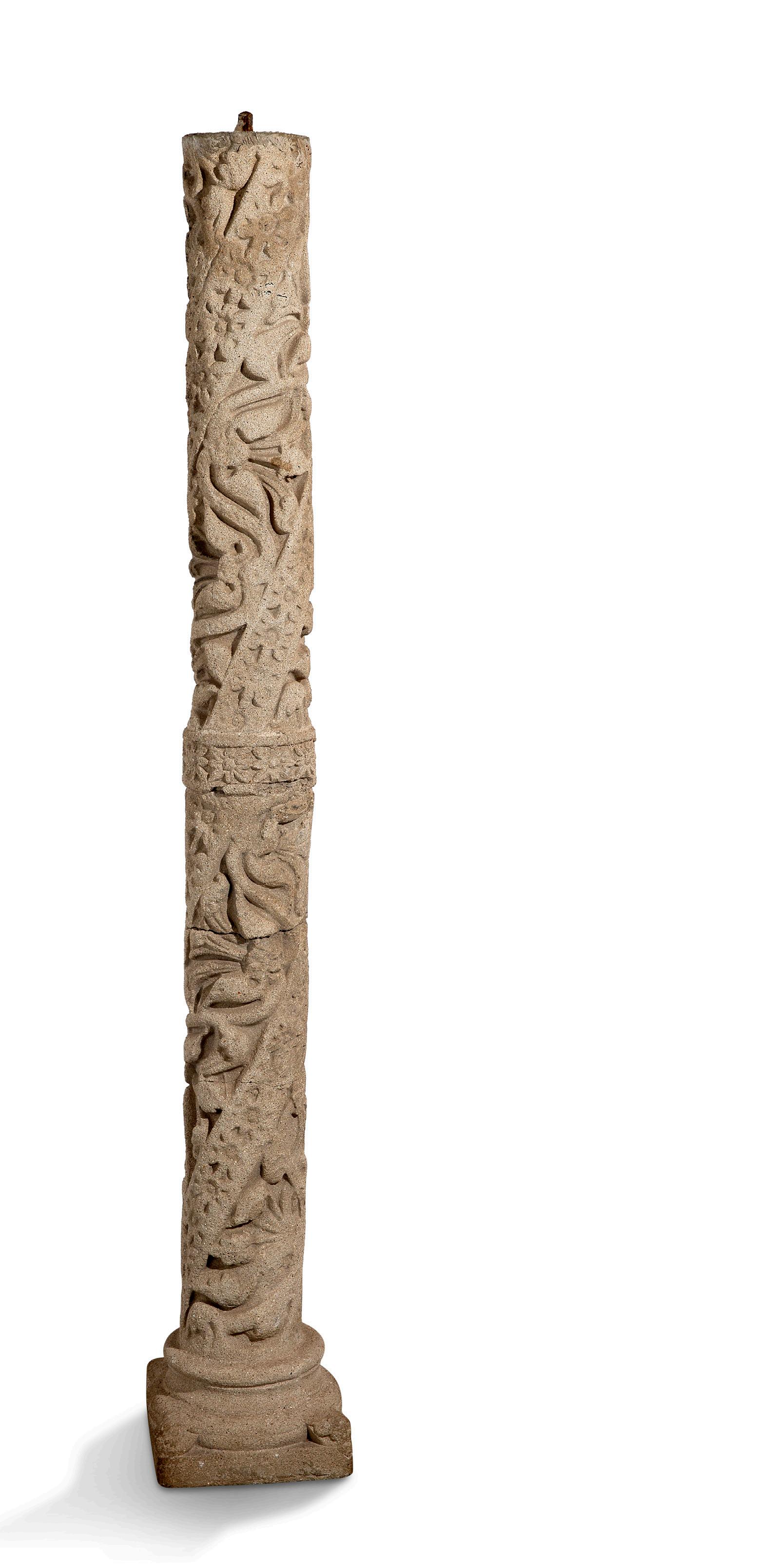 circulaire le fût richement décoré d’une riche ornementation végétale de rinceaux. La base à section carrée. Style Roman de la fin du XII e siècle Hauteur : 148 cm (moulage, petits accidents) 1 500 - 2 000 €