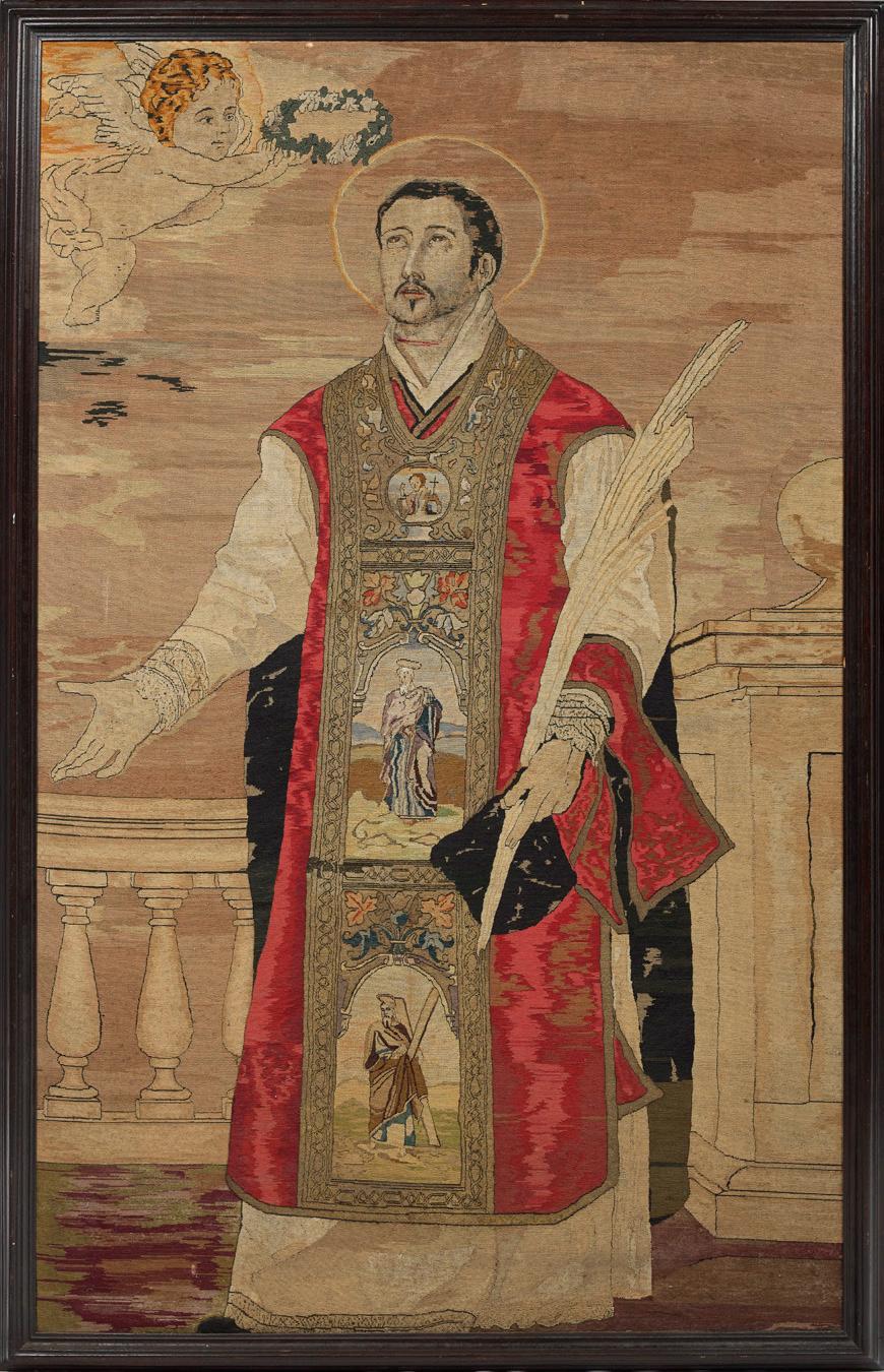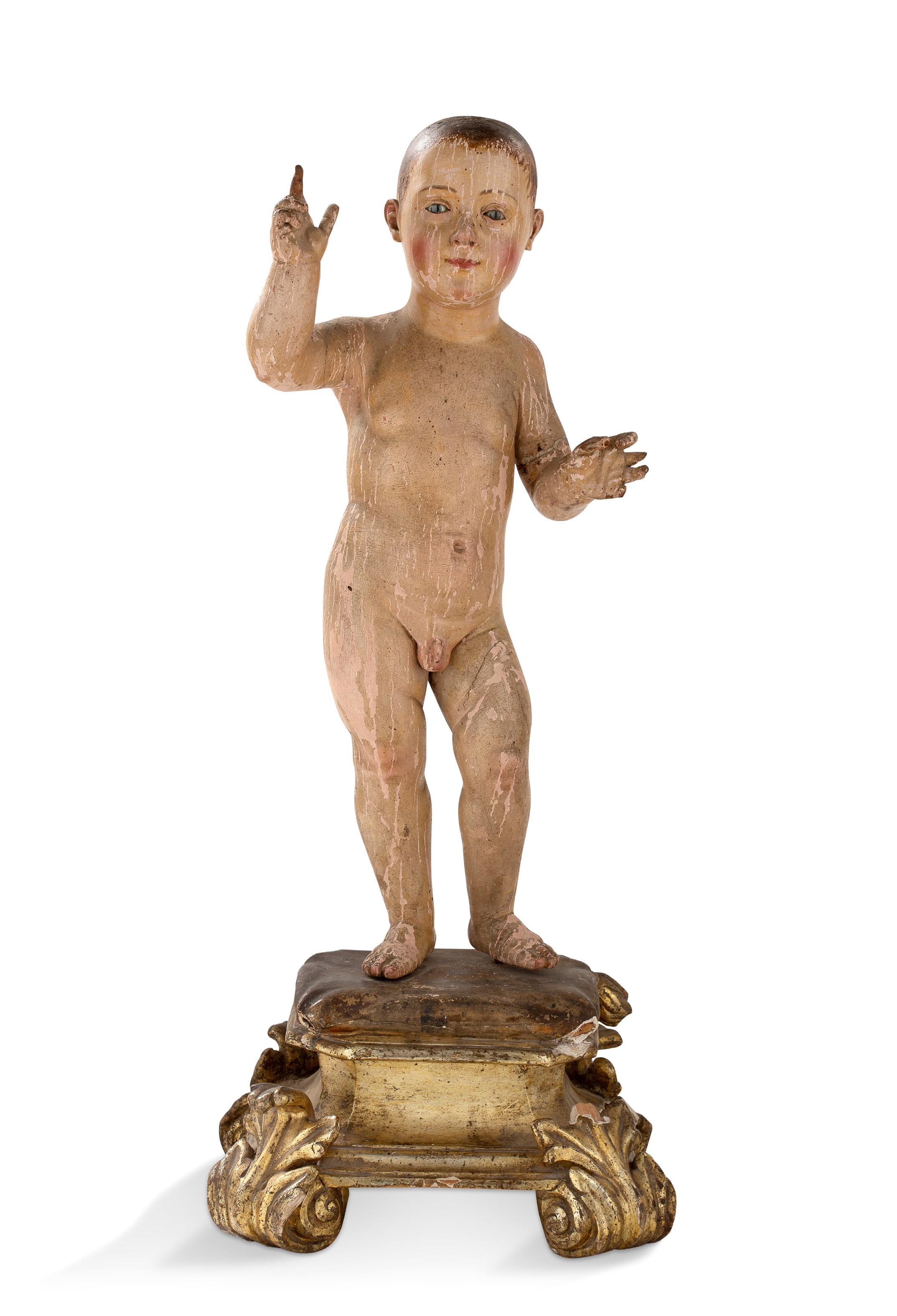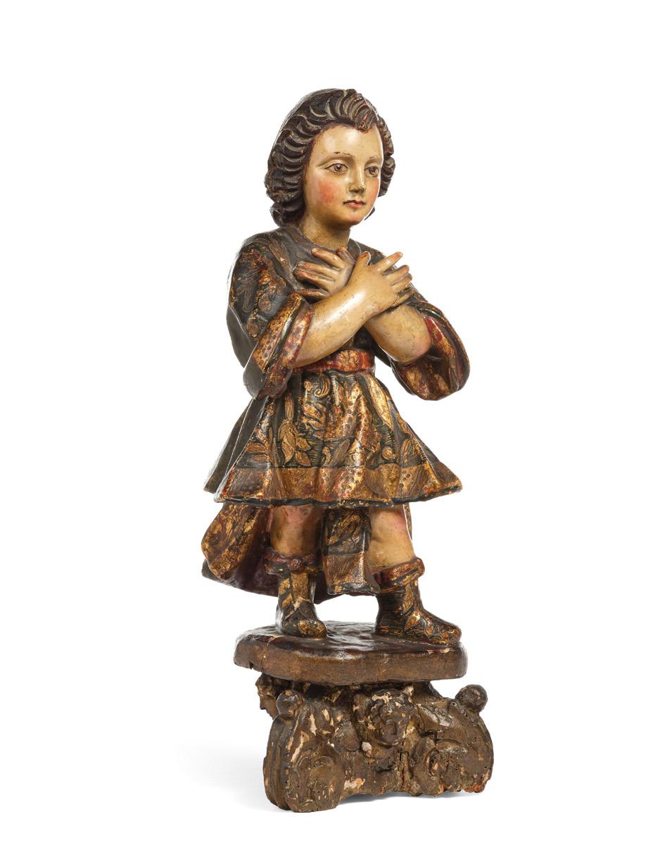 en bois sculpté en ronde-bosse, polychromé et doré. Debout le visage entouré d’une épaisse chevelure et d’une barbe aux mèches ondulées, il est vêtu d’une robe ceinturée et blousante à la taille, d’un long manteau et tient dans sa main droite son attribut.