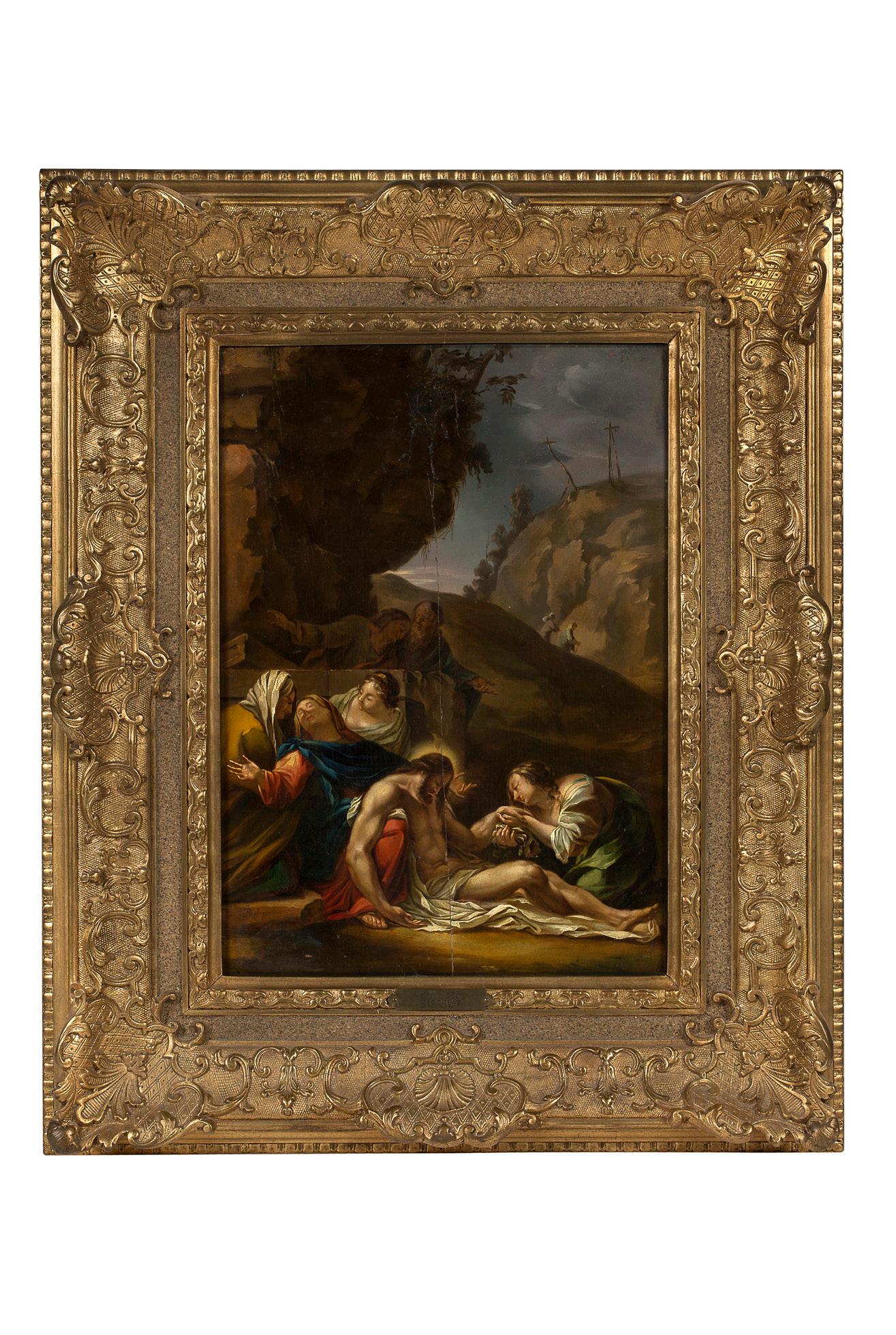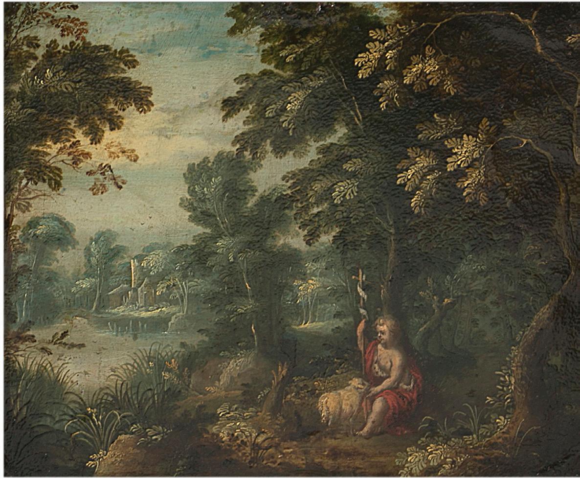 Hauteur : 64 cm - Largeur : 46 cm (accidents et manques, restaurations anciennes, panneau légèrement cintré)