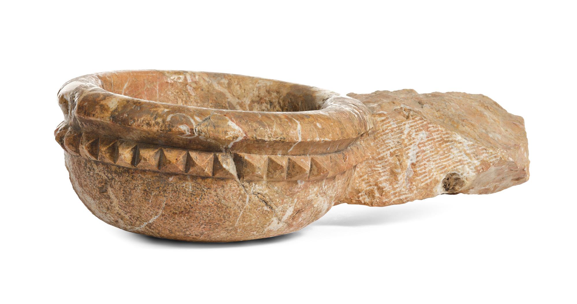 en marbre brêche sculpté, le pourtour orné sous le buvant d’une frise de carrés taillés en pointes de diamants. Avec son tenon. Époque Romane, probablement XI e siècle