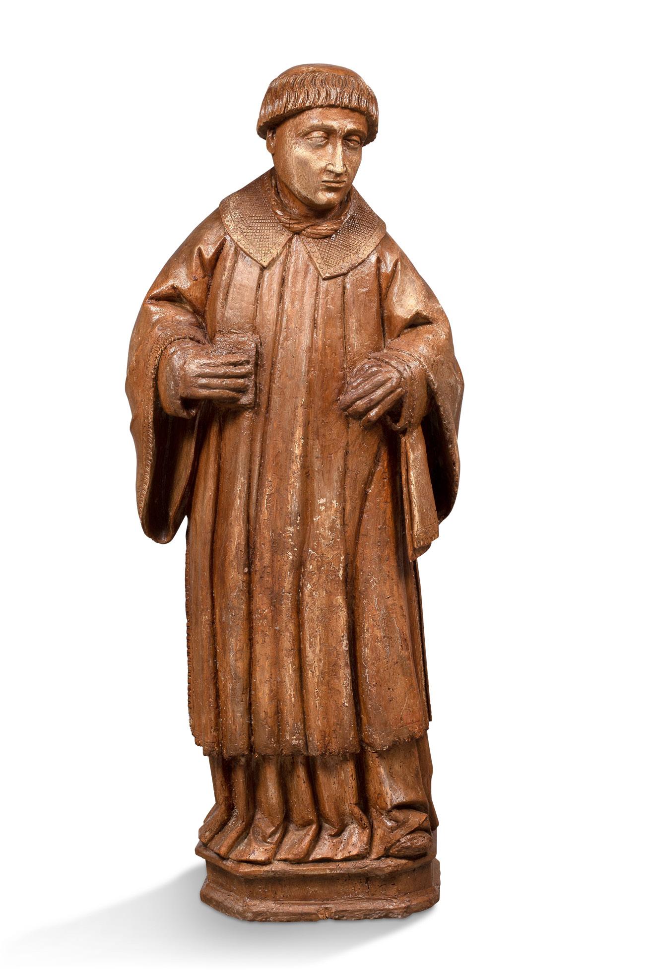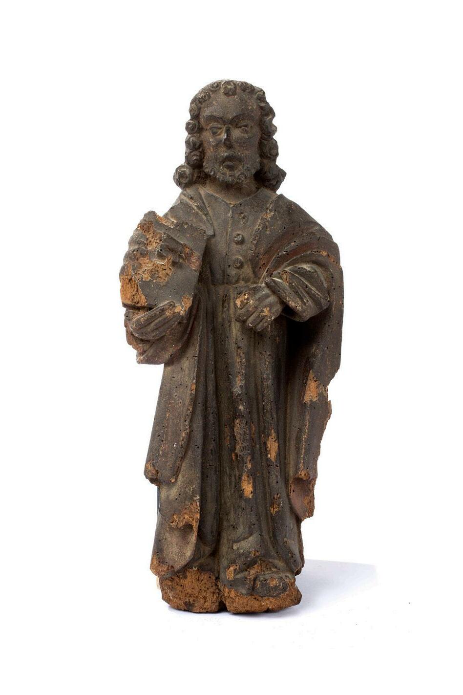 en bois sculpté. Debout, le saint tient un livre fermé de sa main gauche ; il est vêtu d’une robe ceinturée, boutonnée sur le devant, et d’un long manteau.