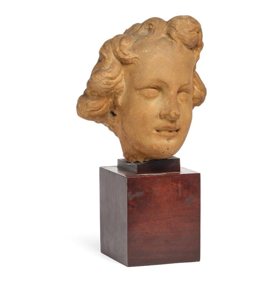 Poitou ?, XIII e siècle Hauteur tête : 22 cm - Largeur : 20 cm Profondeur : 20 cm Soclée. Hauteur totale : 36 cm (restaurations, accidents)