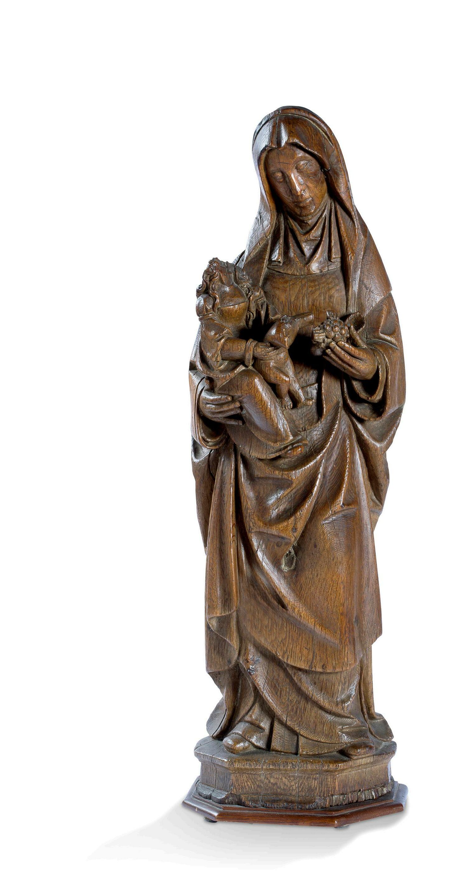 en chêne sculpté, sur son bras gauche est assise la petite Sainte Vierge tenant l’Enfant Jésus penché vers une grappe de raisin proposée par la main droite de sa grand-mère.