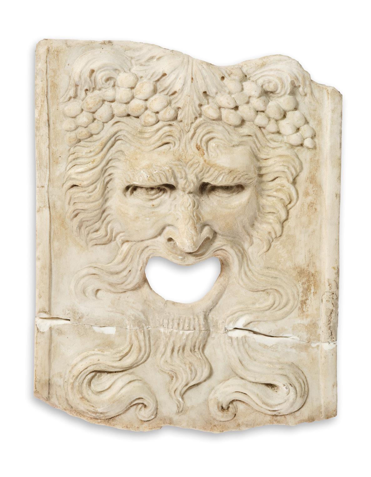 en marbre de Vérone sculpté, le mufle aux narines bien dessinées, les yeux légèrement allongés, une gueule grande ouverte laissant apparaître des crocs.