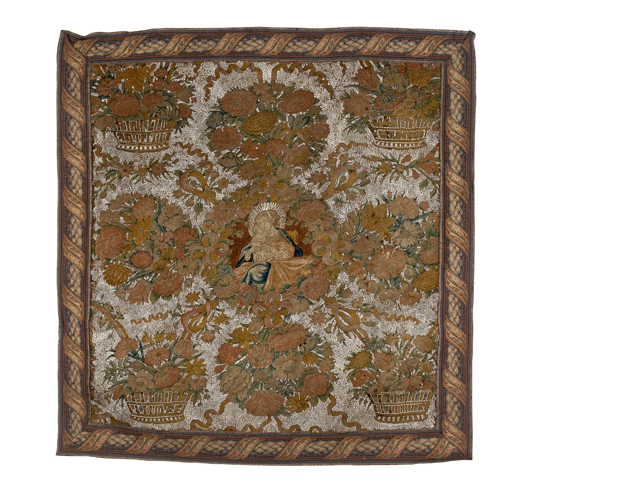 Tempera sur panneau de bois à fond doré incisé où la Sainte Vierge, assise, trône en majesté, couronnée et nimbée, présentant son Enfant Jésus vêtu de rouge et tenant de sa main gauche un oiseau. Italie, style du XIVe siècle