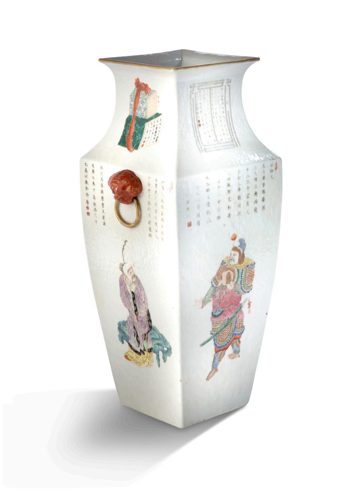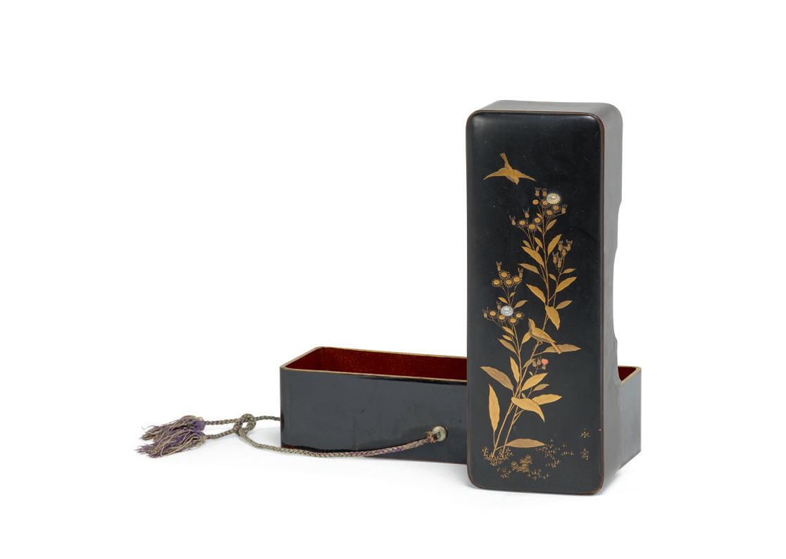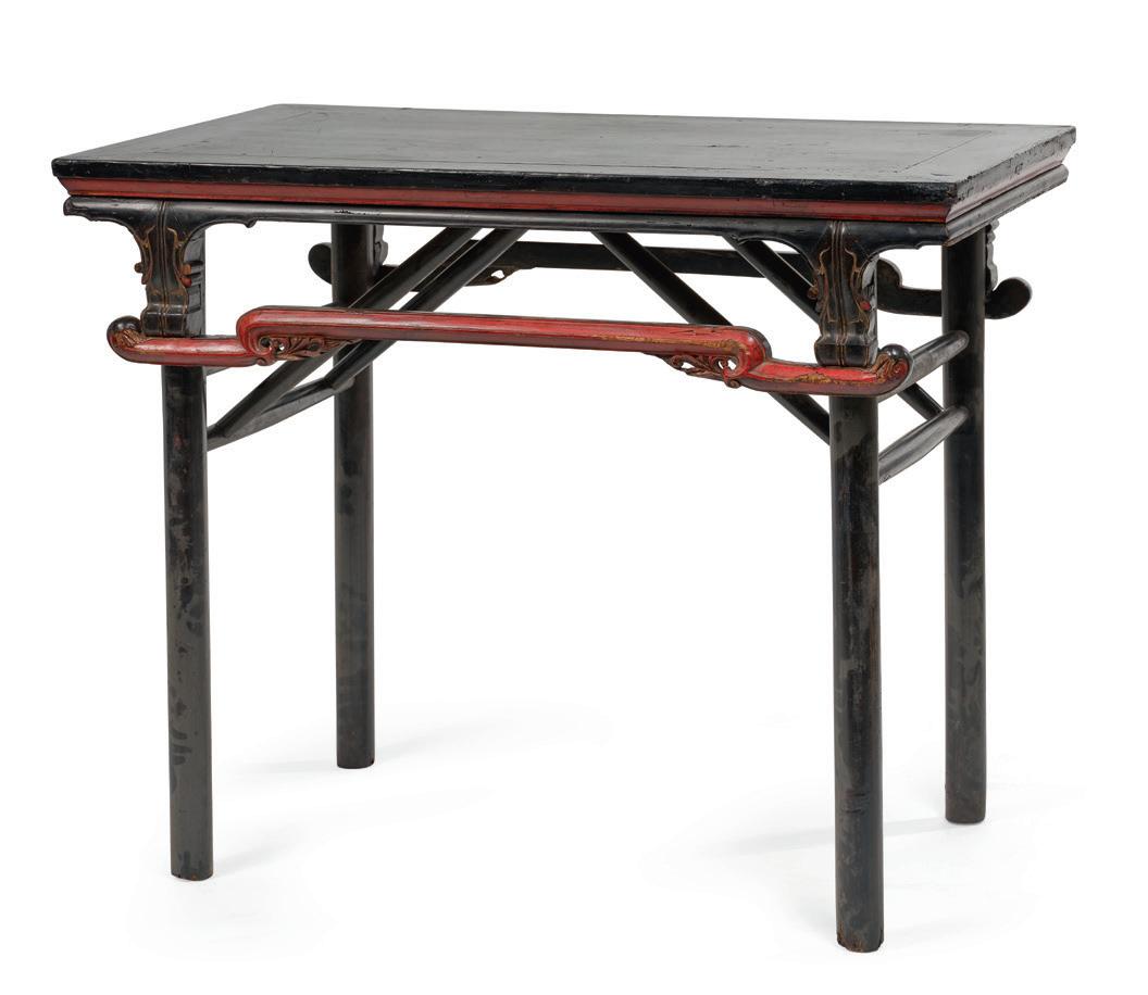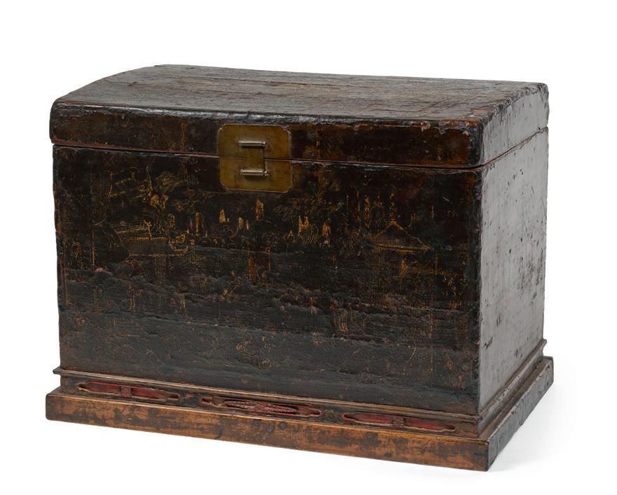 Importante boîte carrée en bois laqué rouge et décor peint à l’or, le couvercle orné de deux dragons pourchassant la perle parmi les nuées. Les côtés décorés des quatre animaux sacrés (« Tu Linh »).