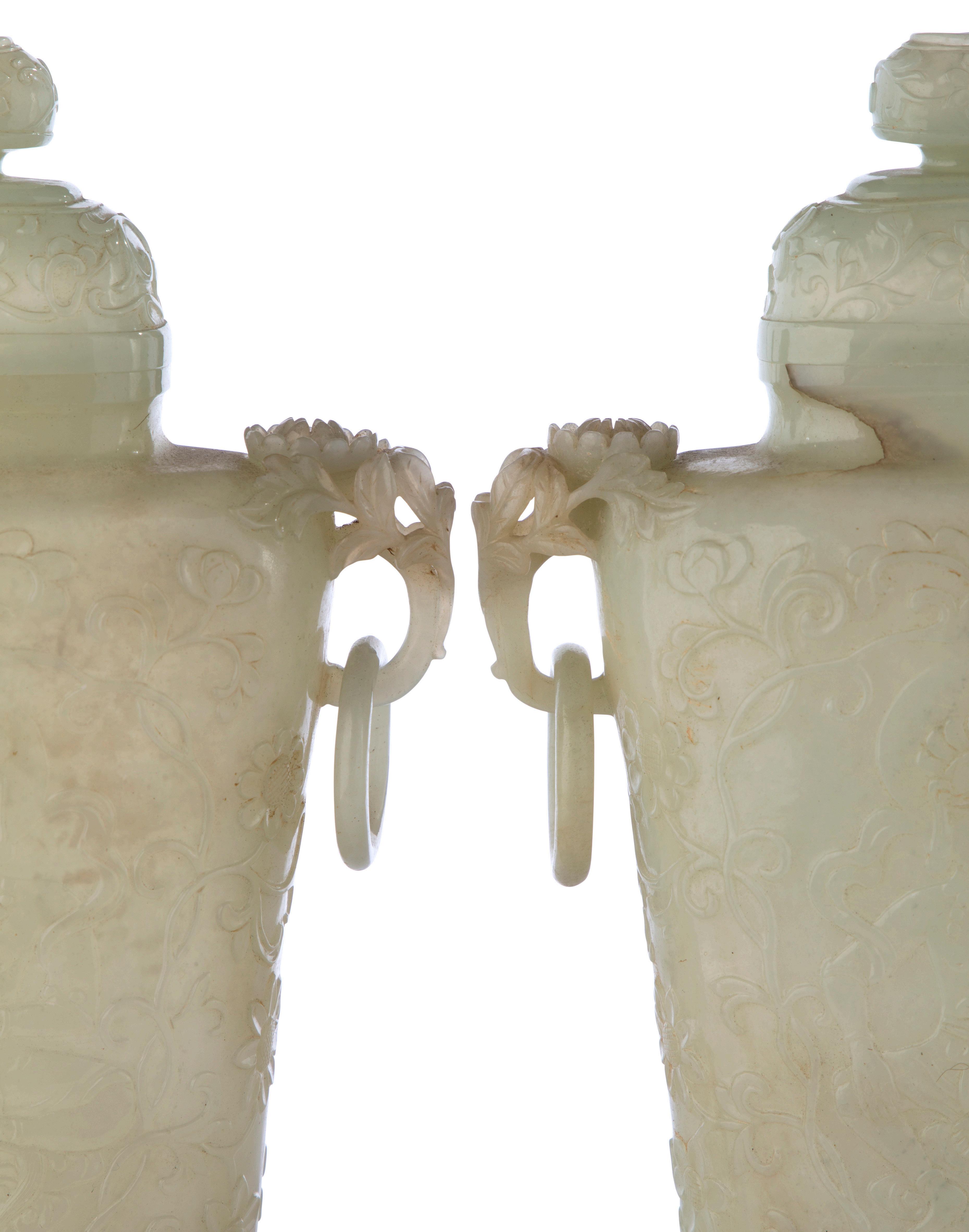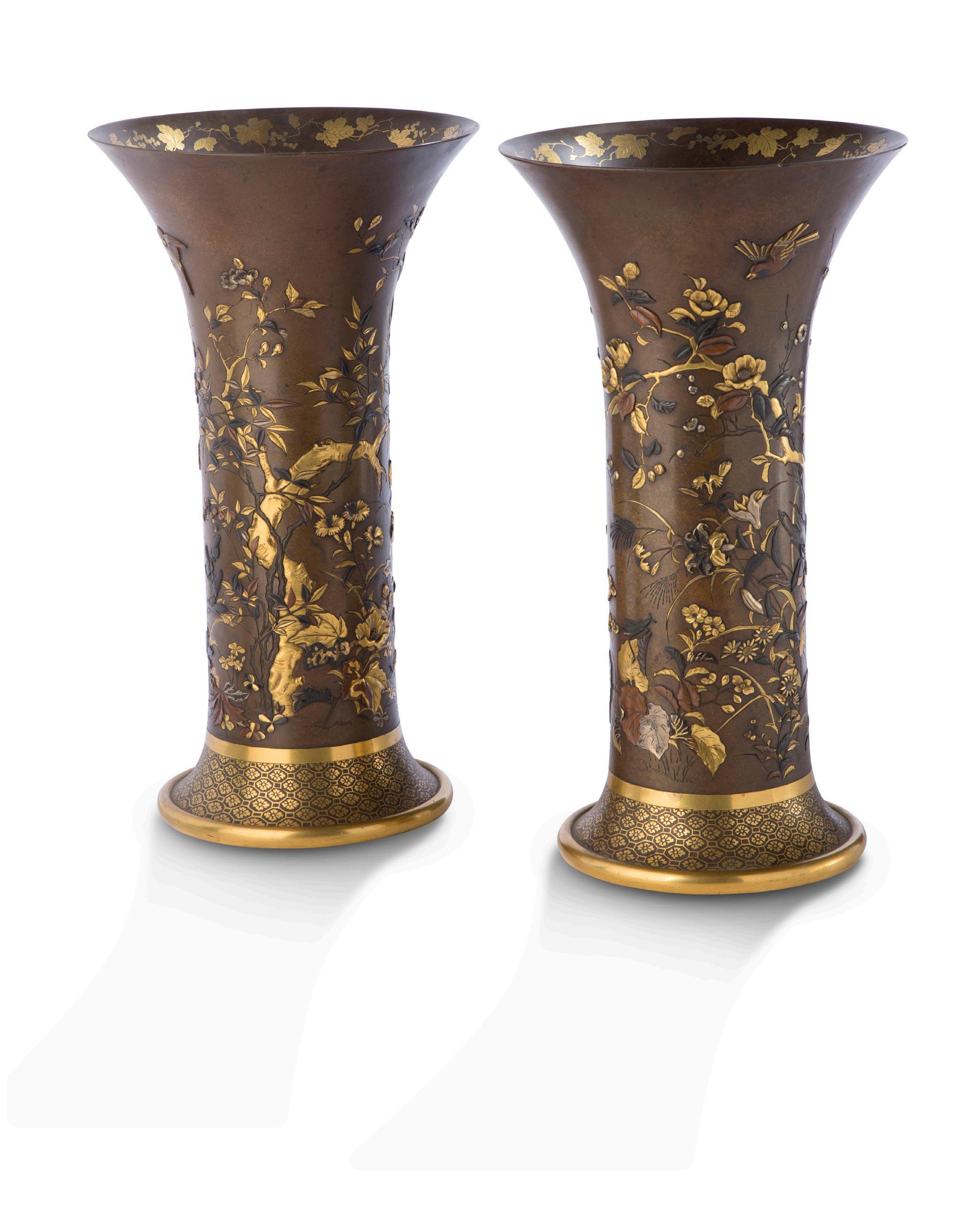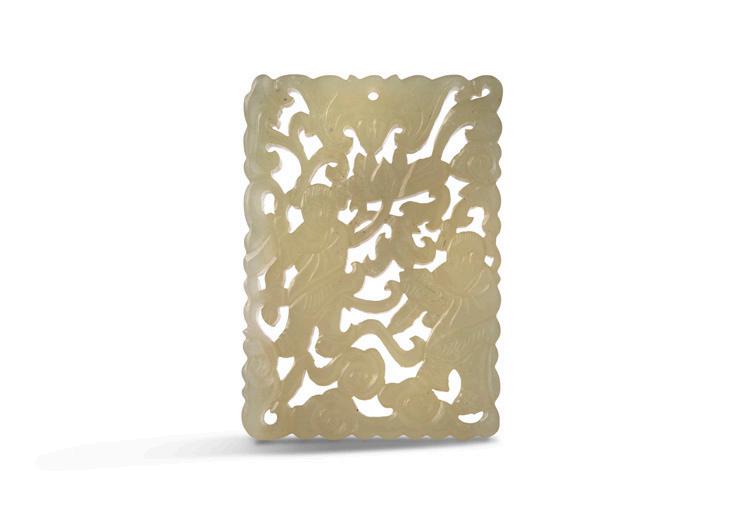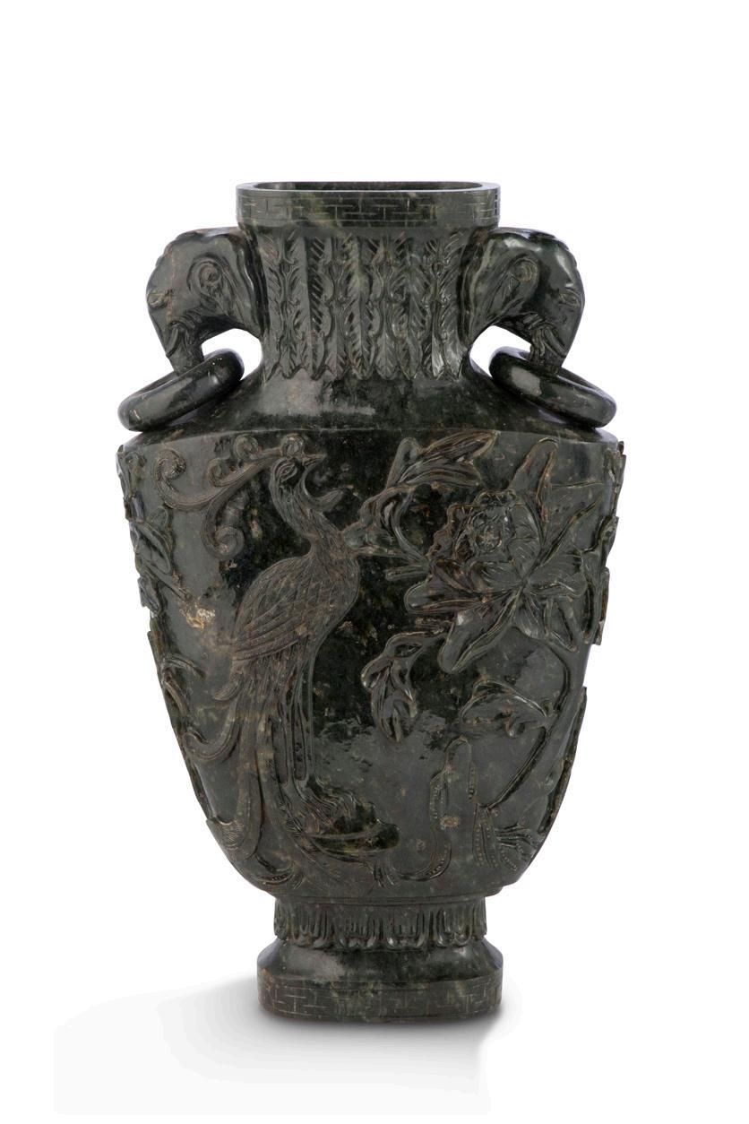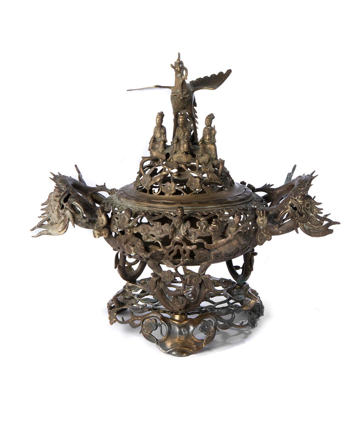 Important brûle parfum tripode couvert en bronze ajouré, la panse globulaire aplatie ornée de volutes nuageuses et des divinités chevauchant des animaux mythiques. Les anses formées de deux dragons sinueux pourchassant la perle. Le couvercle ajouré de branches de prunus fleuries, surmonté par un grand phénix aux ailes déployées dominant les trois divinités du foyer trônant. L’ensemble reposant sur un socle en bronze ajouré à décor de branches fleuries et caractère Shou stylisé.