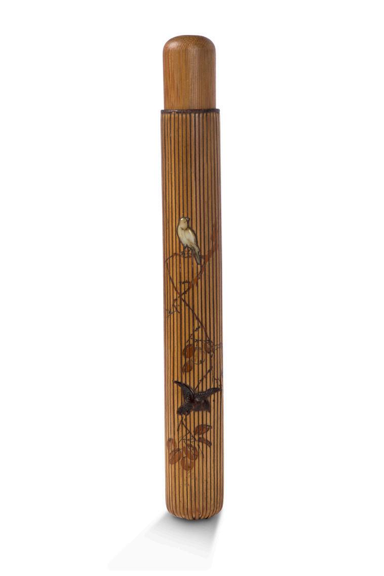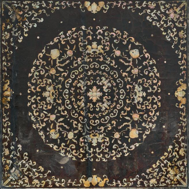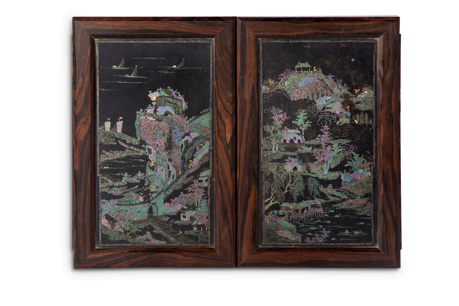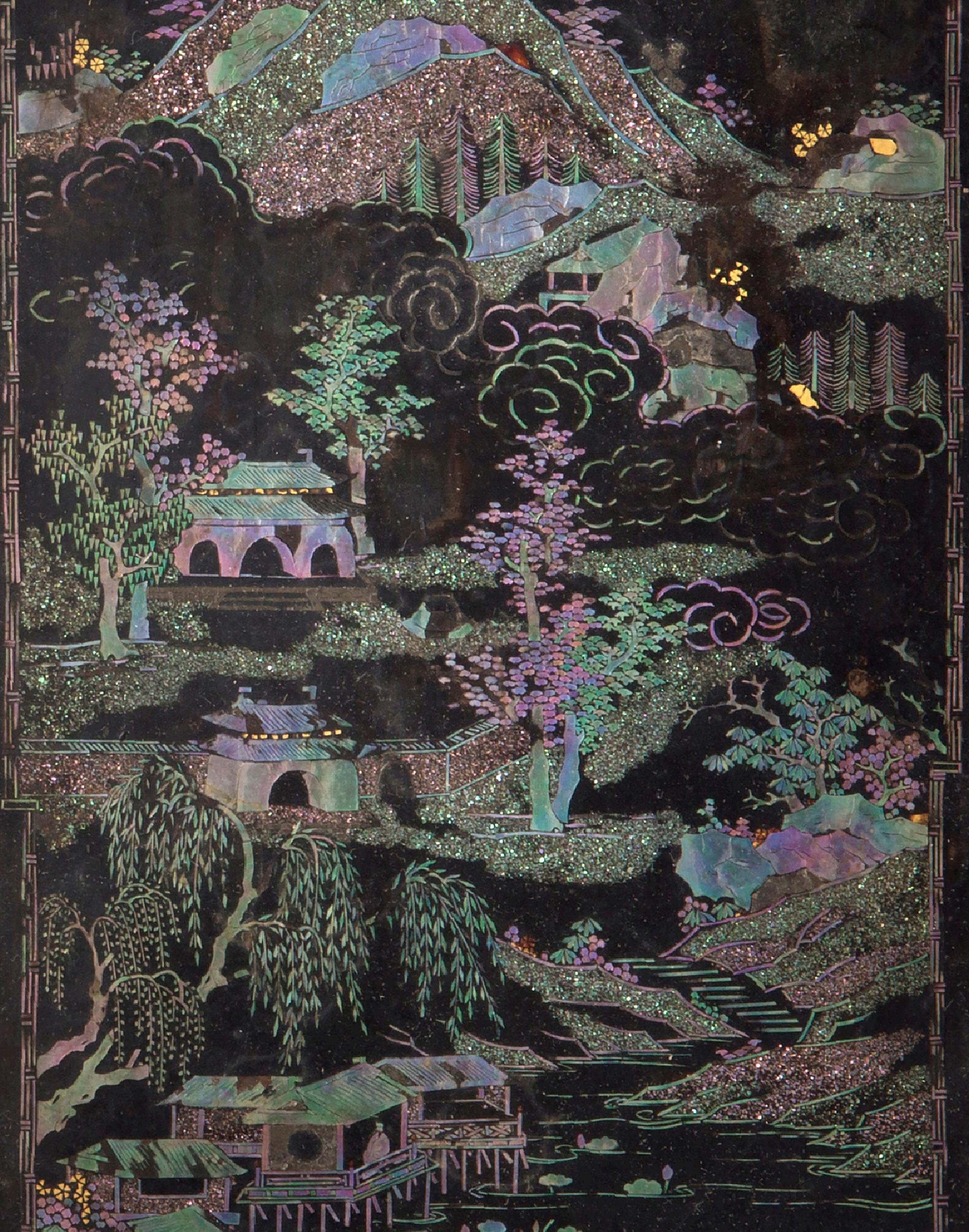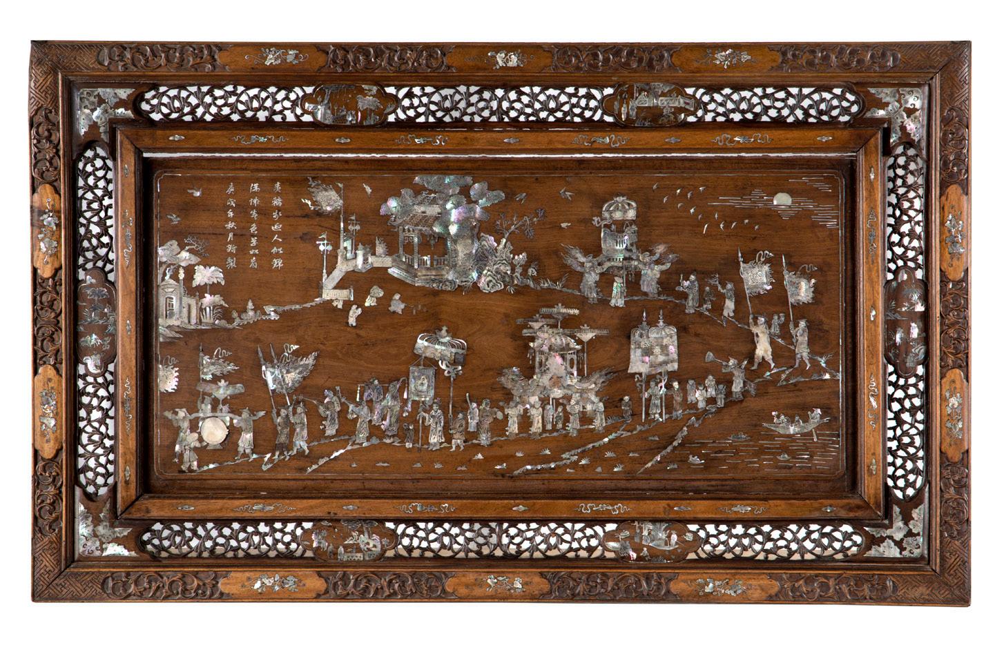 Grand panneau en bois naturel et incrustations de nacre décoré d’une procession serpentant dans un paysage lacustre ponctué de pavillons. L’ensemble dans un encadrement de rinceaux ajourés et réserves quadrilobées.