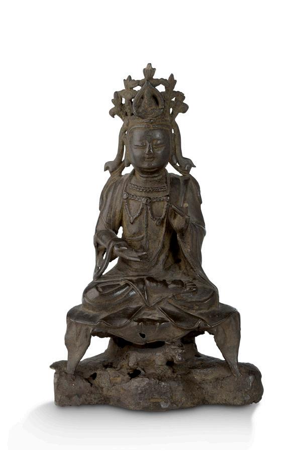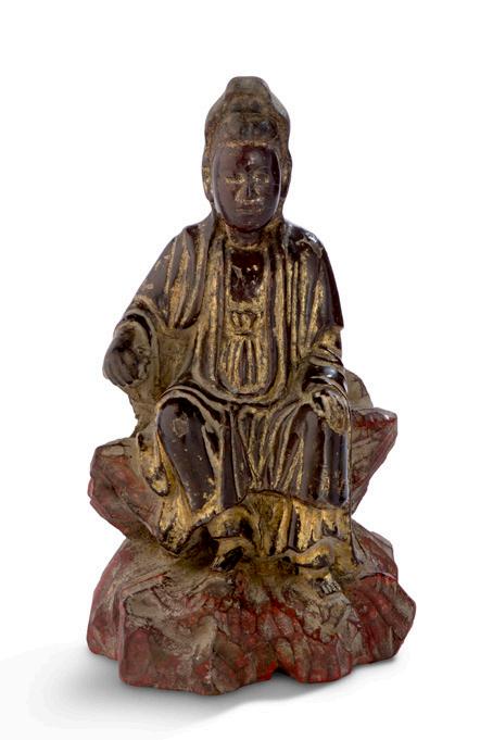 Statuette en bois laqué brun rouge et traces de dorures représentant un bodhisattva assis en pralambapadasana sur un trône rocheux.