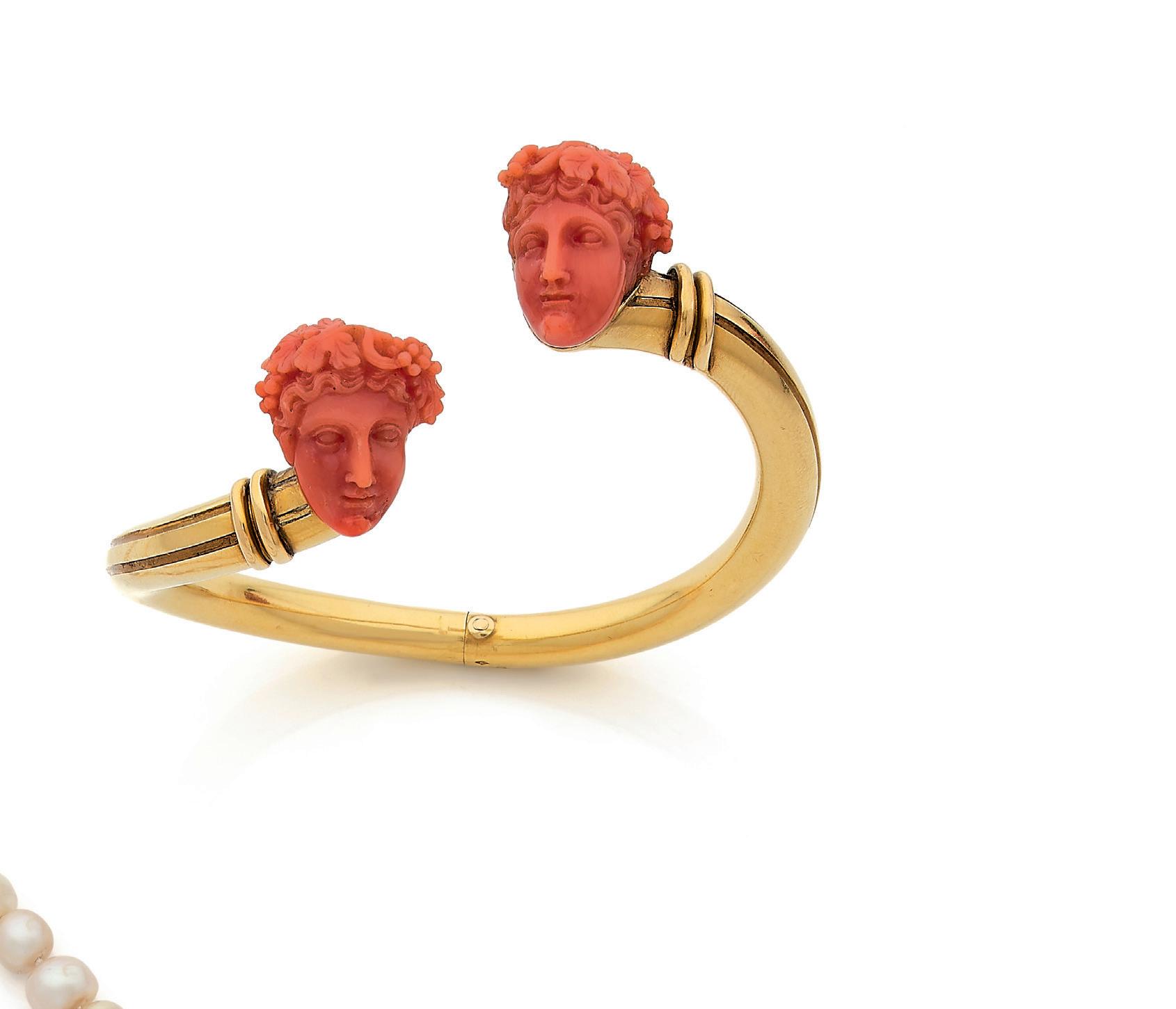 Jonc orné de corail sculpté à l’antique, or 18k (750)
