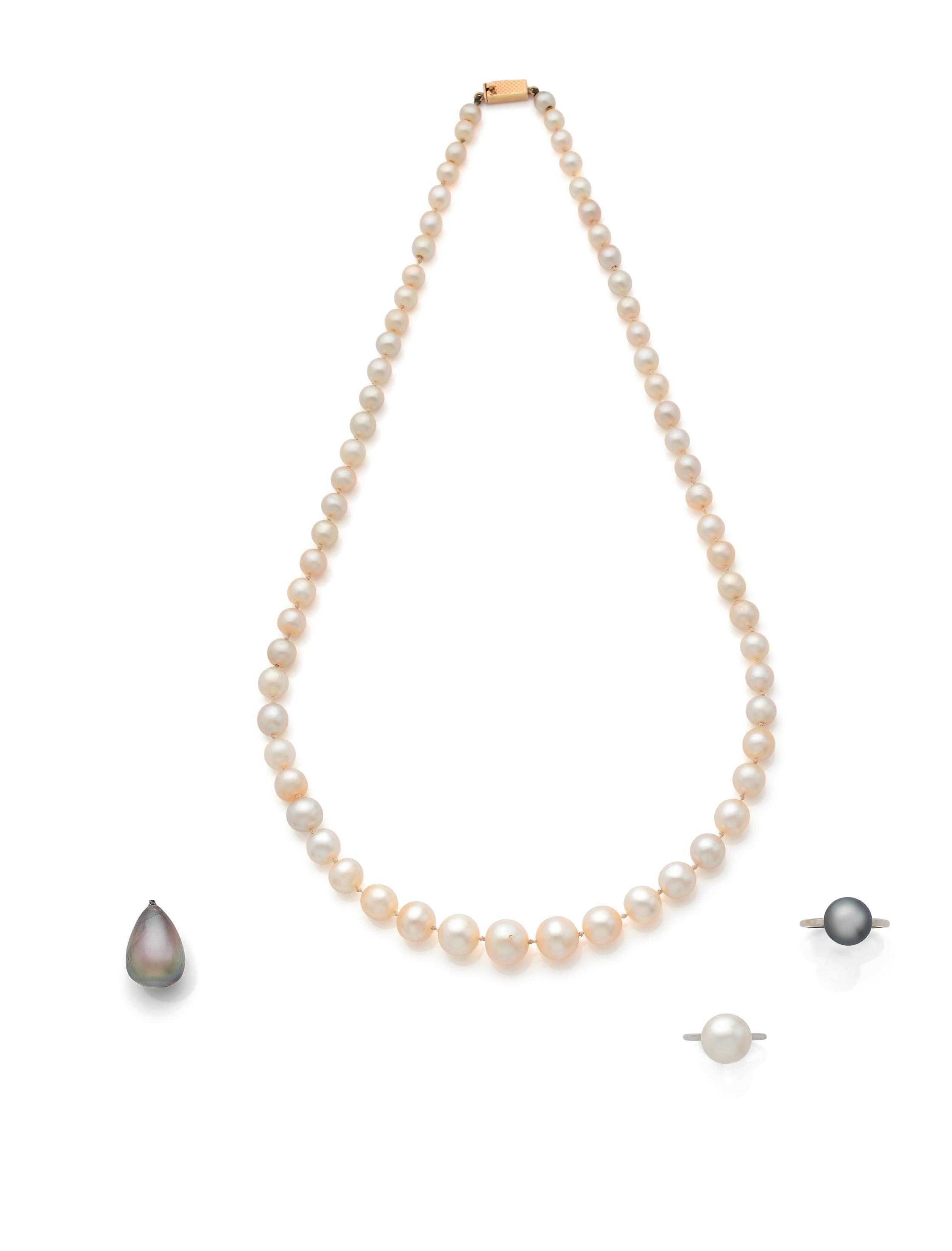 On y joint un collier de 156 perles supposées fines, non testées, en chute Dim. : 4.6 x 2.2 mm env. Pb. : 5.1gr