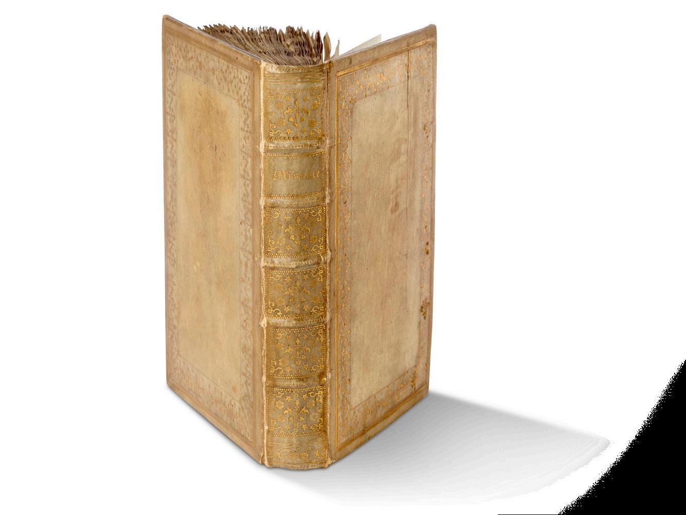 Reliure veau brun glacé XVII e siècle, dos à 4 nerfs, fleurons dorés, plats bordés de 2 filets avec fleurons angulaires et au centre en fleurons le motif d’une croix avec instruments de la Passion, le tout doré, tranches dorées, restes de fermoirs (défauts dont fentes aux mors, coins émoussés, griffures superf. aux plats).