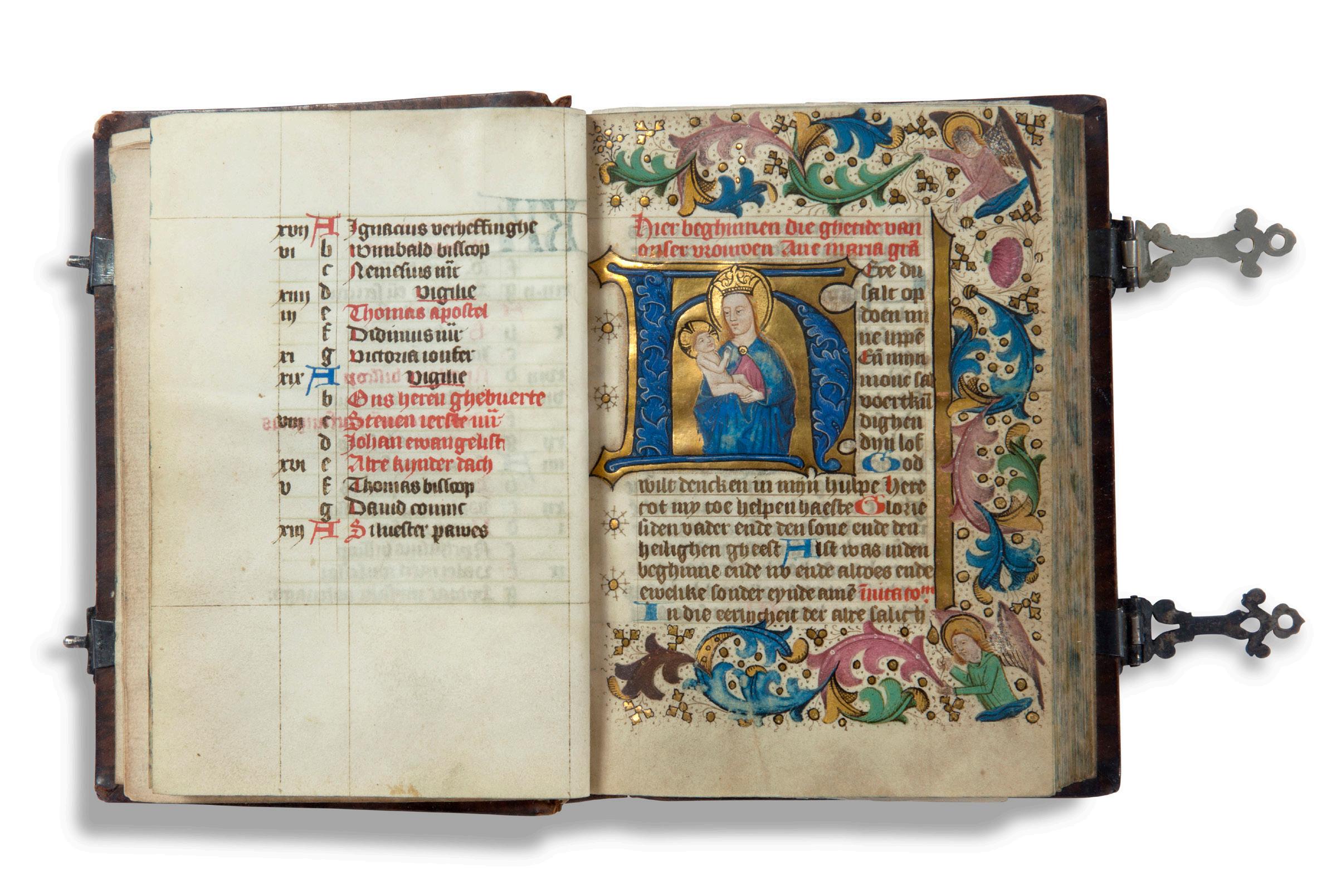 der Heilige Maagd: Heures de la vierge. Rubr. « Hier beghinnen die gethide van onser vrouwen. » - f.51r-74v : Getijden der Eeuwige Wijsheid : Heures de la sagesse éternelle de Henricus Suso. Rubr. « Hier beghint die prologus vander ewigher wijsheit » - f.75r-102v : Getijden van de Heilige Geest : Heures du saint esprit : Rubr. « Hier beghinnen die gethide vanden heilighen gheeste ». - f.103r-127v : Lange Getijden van het Heilige Kruis : Longues Heures de la croix : Rubr. « Hier beghinnen die langhe gethide vanden heiligehen cruis ». - f.128r-137r : Boetpsalmen: Psaumes pénitentiels - f.137r148r : Litanie : on retrouve les saints honorés à Utrecht : Boniface, Lebuin, Willibrord, Aldebert, Ludger, etc. - f.149r-186r: Vigilie : Office des morts.