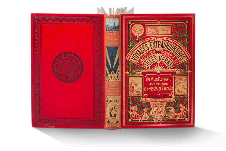 En fin de vacation seront proposés quarante-sept volumes de la série des Voyages extraordinaires de Jules Verne dans des cartonnages Hetzel.