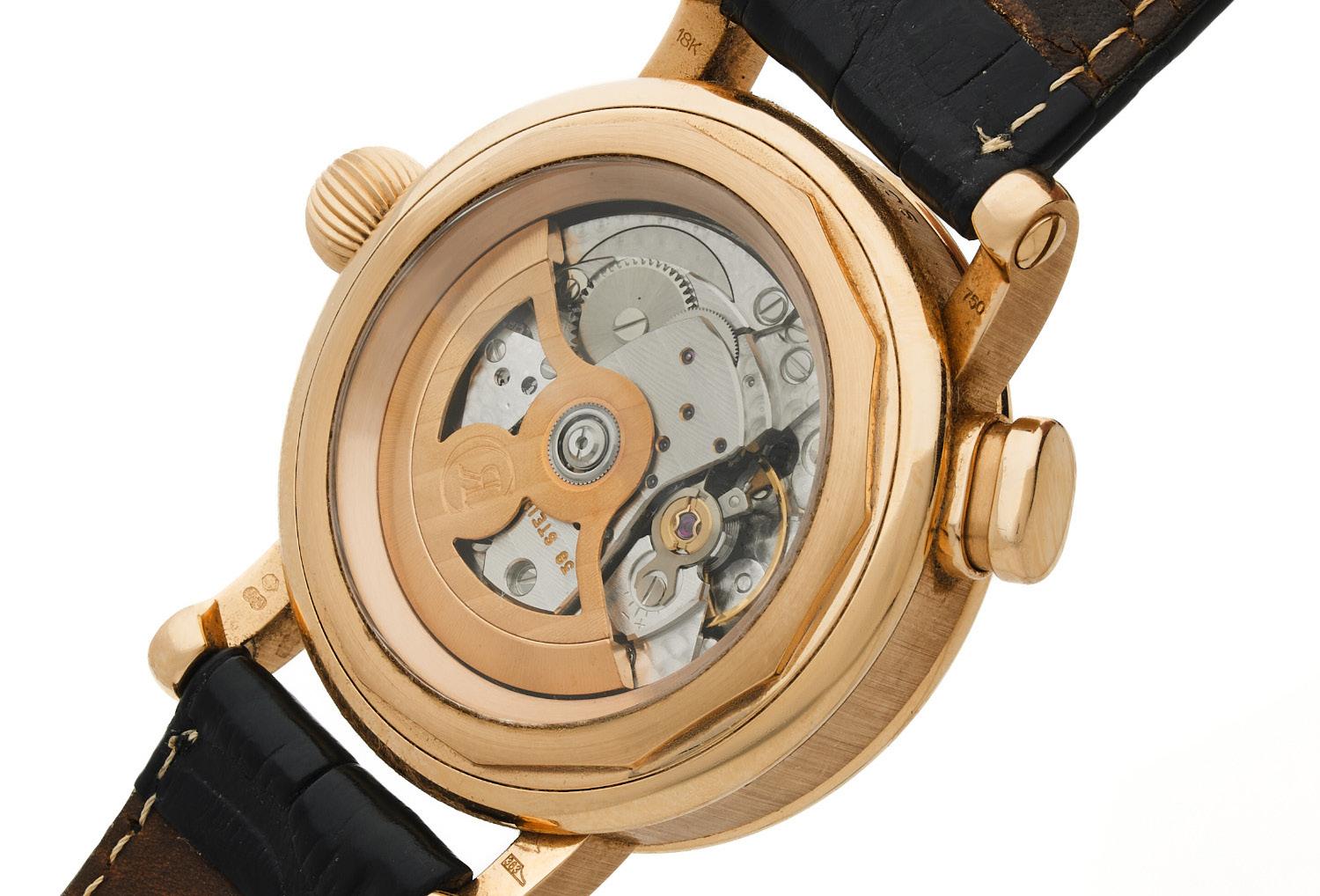 Boîtier : rond, fond transparent avec rotor visible, numérotation et signature sur le mouvement