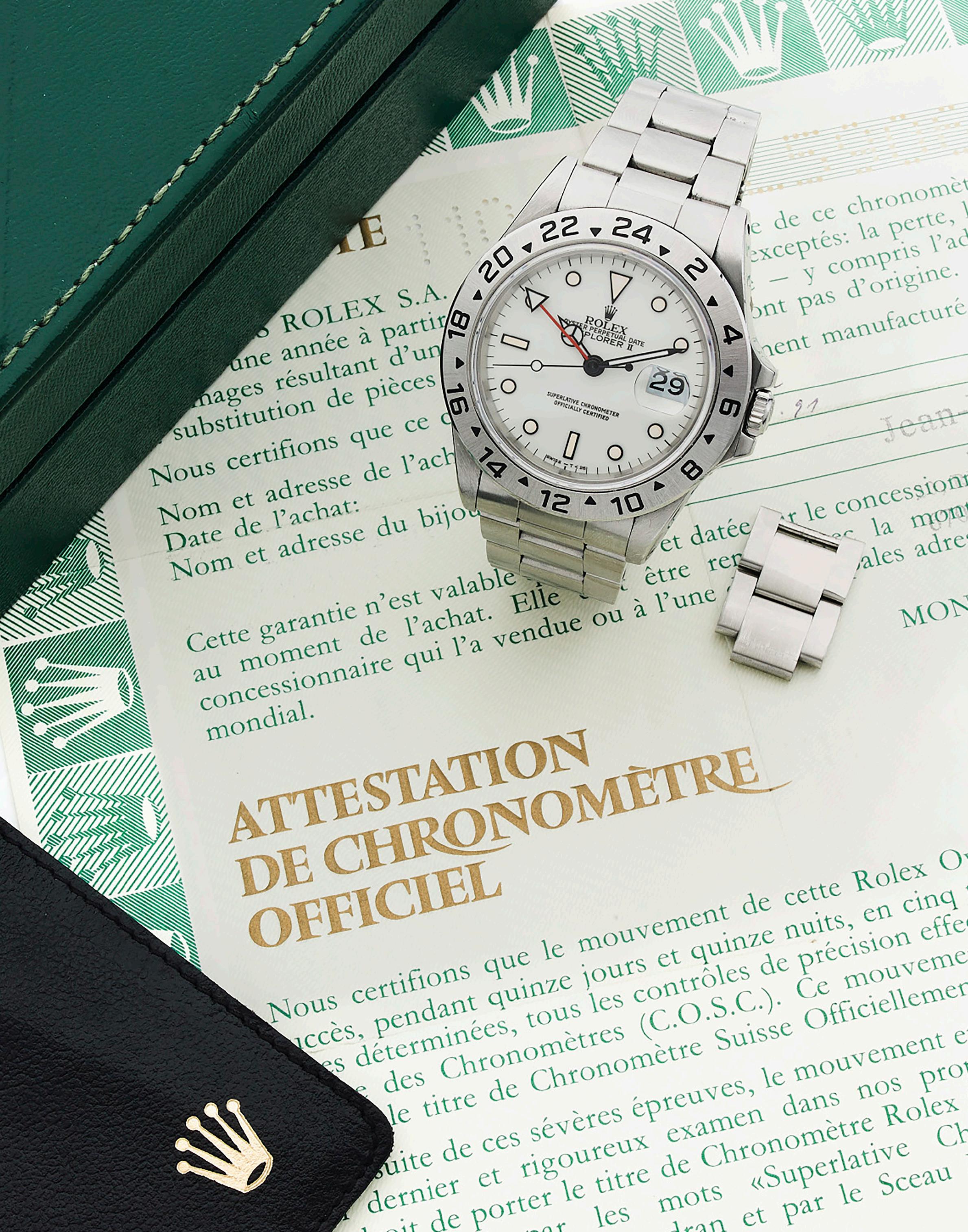 Avec : un écrin, certificat de garantie en date du 30.08.1991, une garantie de service Rolex en date du 29.07.2009, les factures correspondantes, un livret, pochette simili cuir noir et deux maillons supplémentaires