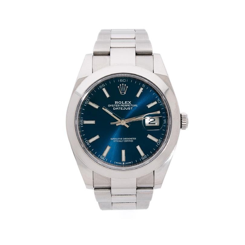 Cadran : bleu avec index bâtons et aiguilles luminescentes, trotteuse centrale, minuterie chemin de fer, date à guichet, signé