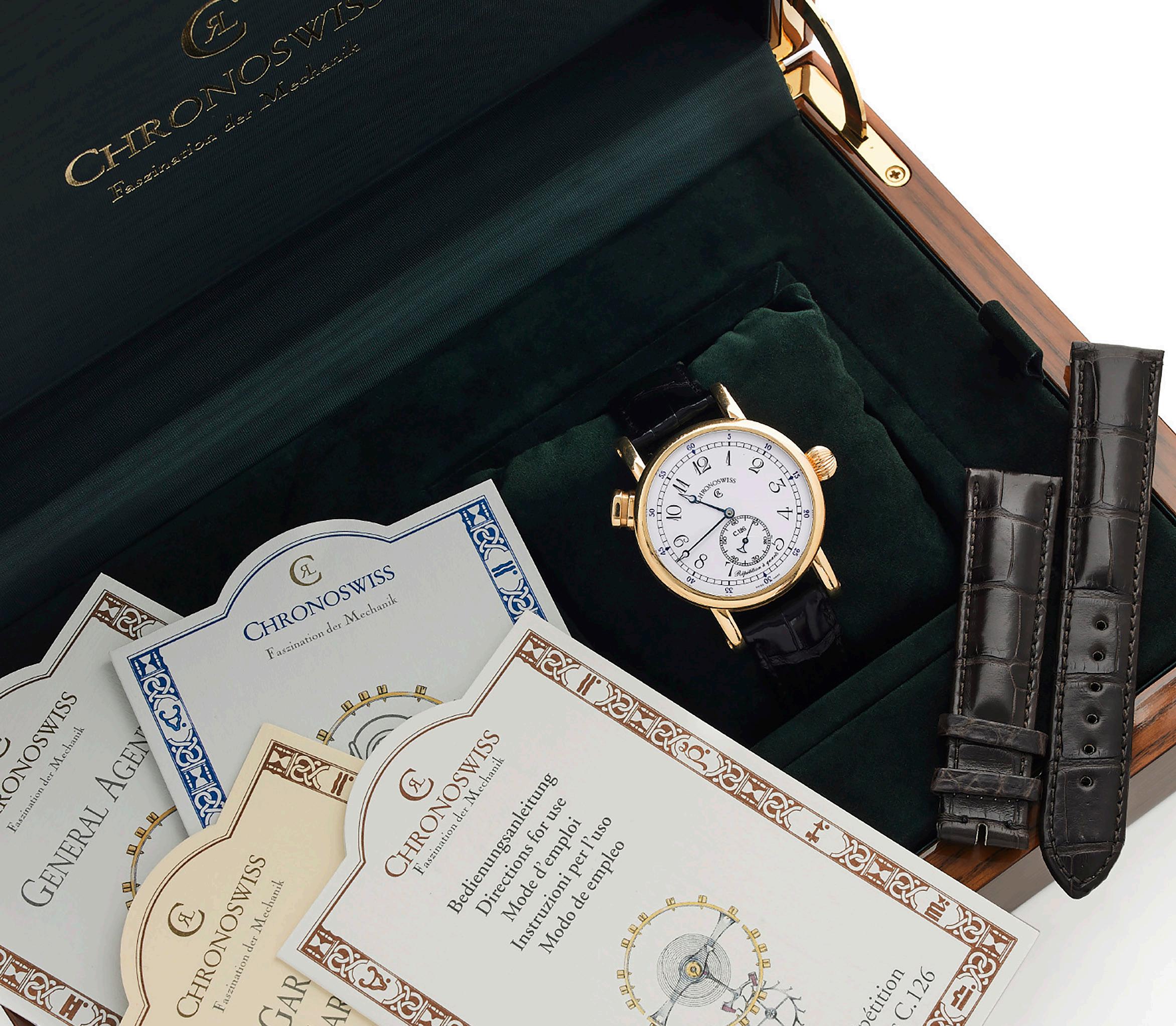 Avec : un écrin, une surboîte, un certificat JLC, un bulletin de garantie JLC, deux certificats de réparation JLC