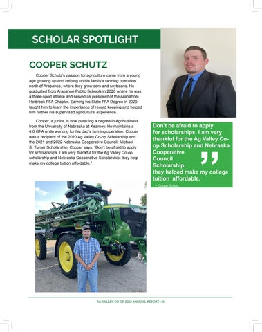 SCHOLAR SPOTLIGHT COOPER SCHUTZ Cooper Schutz’s passion for agriculture came from a young age growing up and helping on his family’s farming operation north of Arapahoe, where they grow corn and soybeans. He graduated from Arapahoe Public Schools in 2020 where he was a three-sport athlete and served as president of the ArapahoeHolbrook FFA Chapter. Earning his State FFA Degree in 2020, taught him to learn the importance of record keeping and helped him further his supervised agricultural experience. Cooper, a junior, is now pursuing a degree in Agribusiness from the University of Nebraska at Kearney. He maintains a 4.0 GPA while working for his dad’s farming operation. Cooper was a recipient of the 2020 Ag Valley Co-op Scholarship and the 2021 and 2022 Nebraska Cooperative Council, Michael S. Turner Scholarship. Cooper says, “Don’t be afraid to apply for scholarships. I am very thankful for the Ag Valley Co-op scholarship and Nebraska Cooperative Scholarship; they help make my college tuition affordable.”