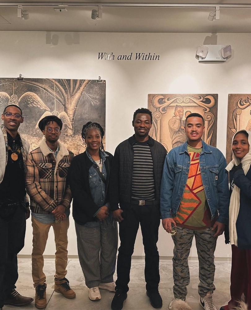 The work in With and Within touches on the nuances experienced by artists from the African diaspora and the realities experienced by Black artists working today. These artists take on complex histories as their subject matter, transmuting elements in their artworks into a call for a brighter future. Various iconography, encompassing personal and spiritual symbols, captures tender family bonds and the power of shared heritage. These visuals are layered through the lens of the natural world, embracing a diverse array of mediums including cardboard, thread, fabric—speaking to the transience of our lived realities and the power realized by speaking future equity into being.