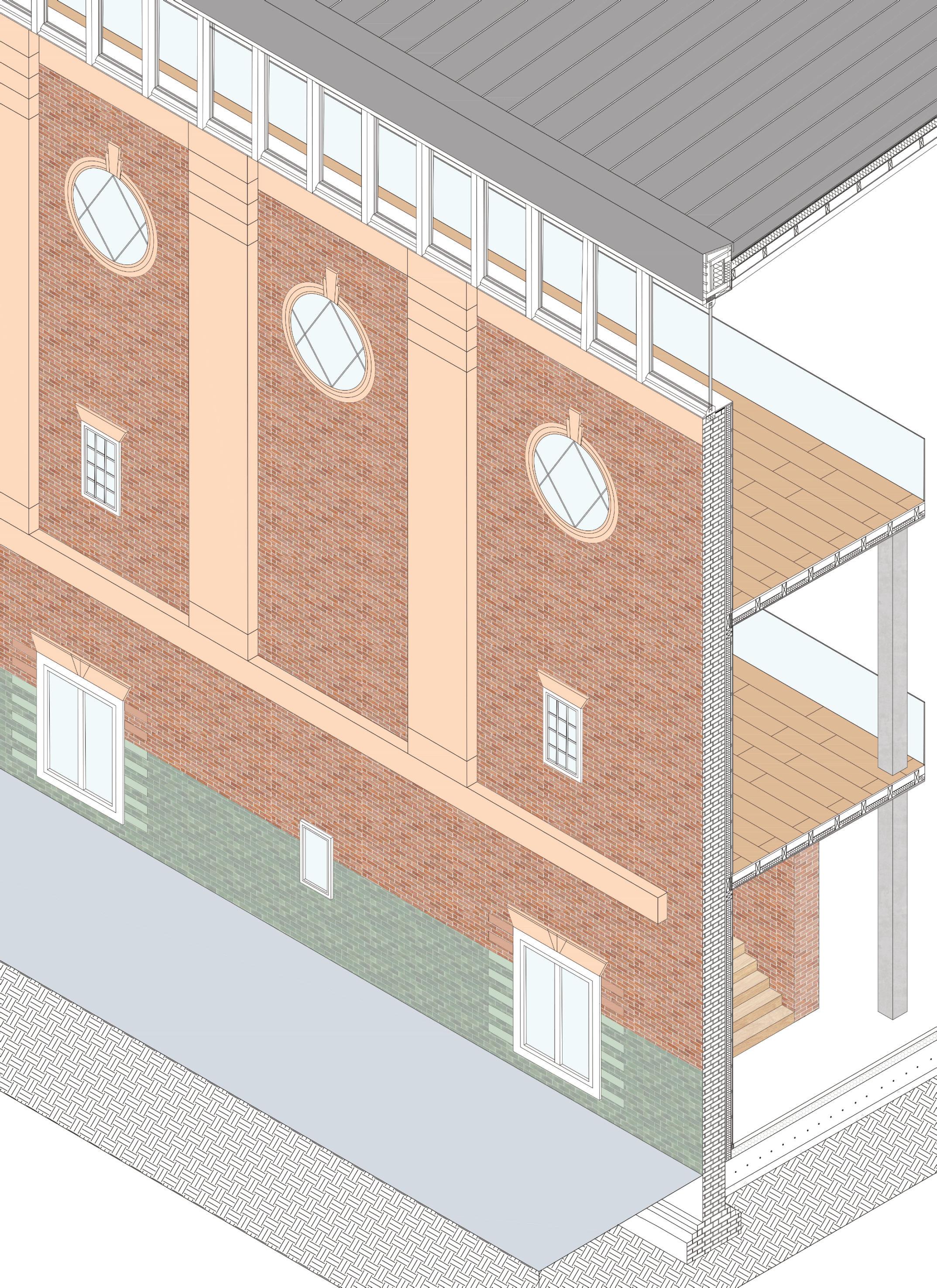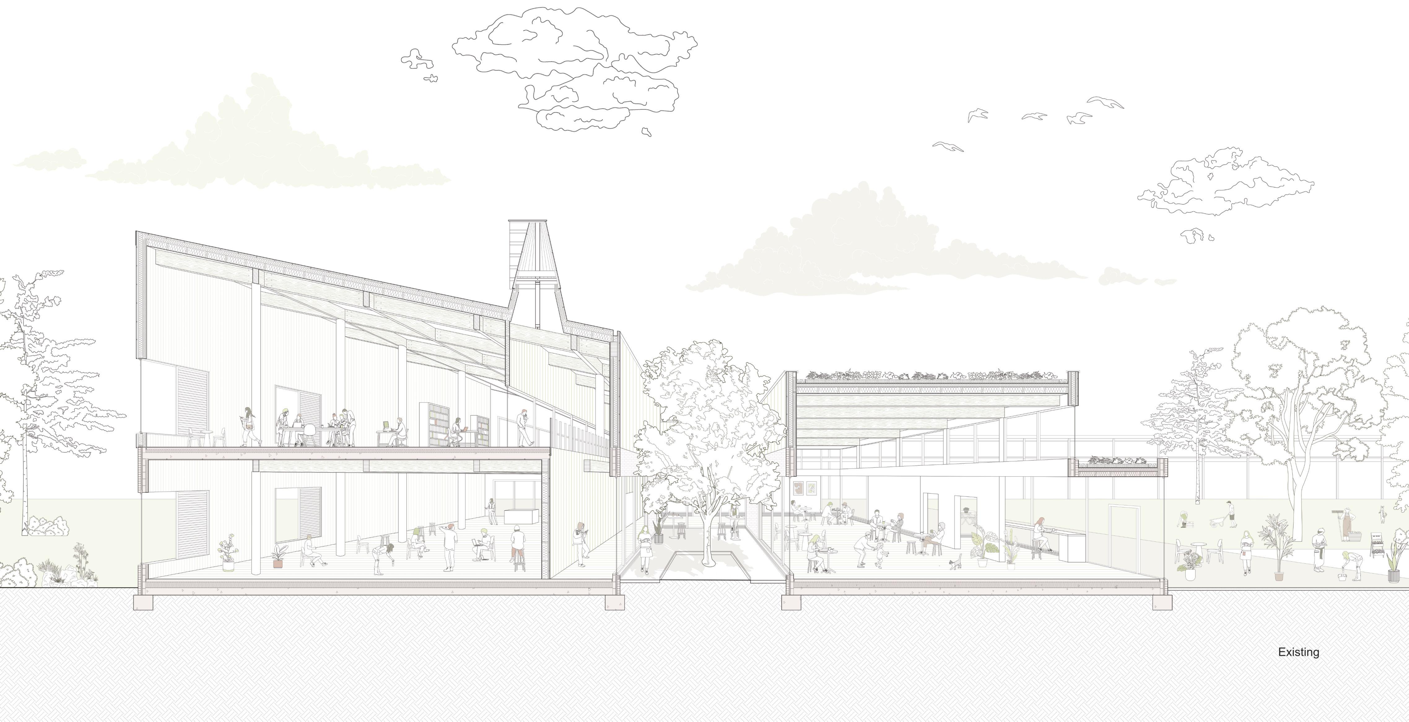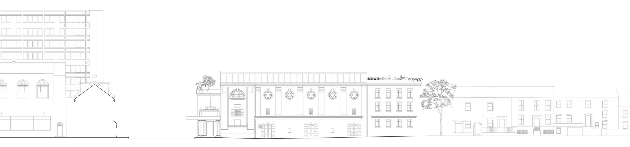 Furthermore, the collapsed roof has been replaced with a flat standing seam zinc roof that covers the existing theatre space.