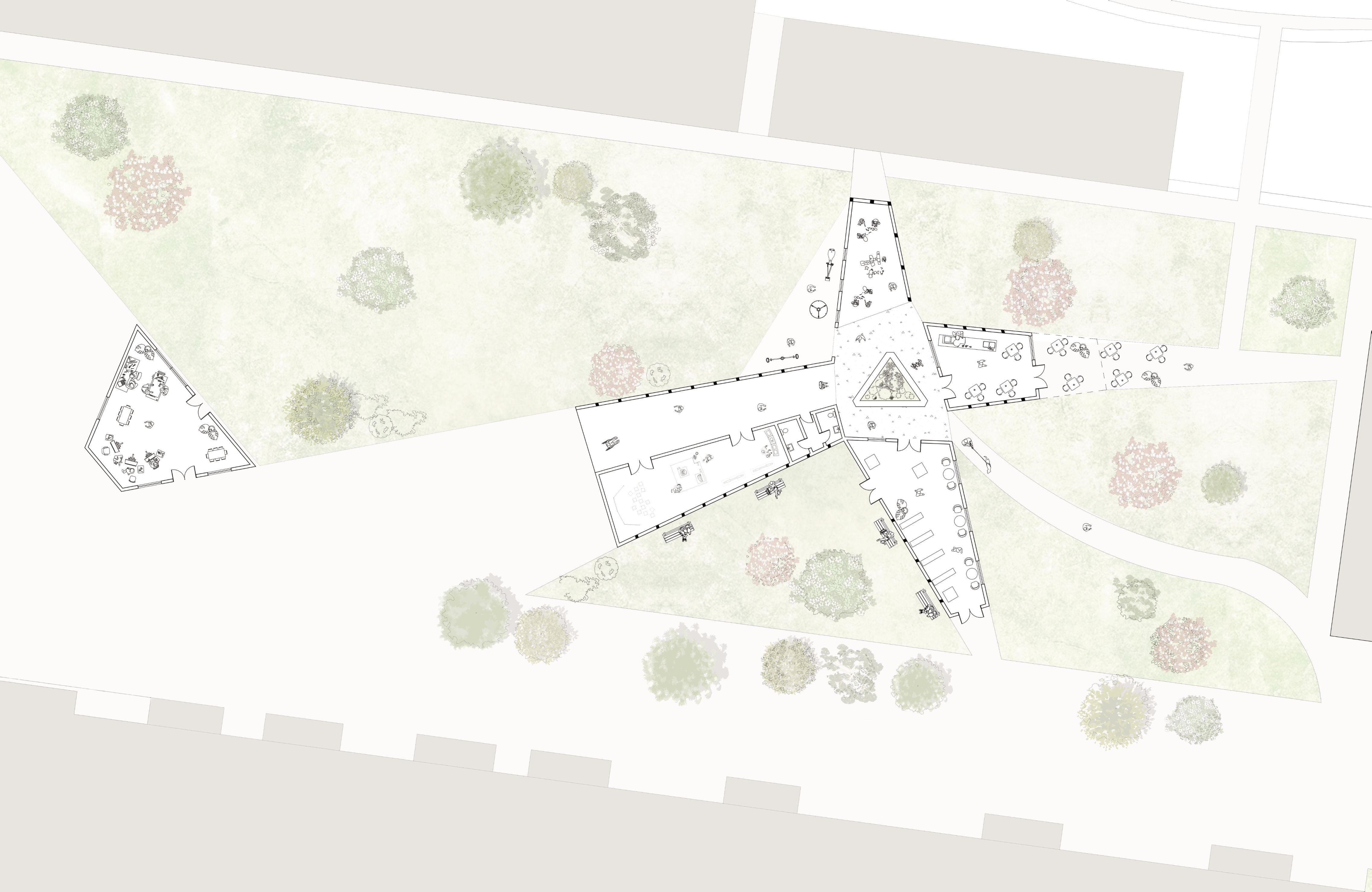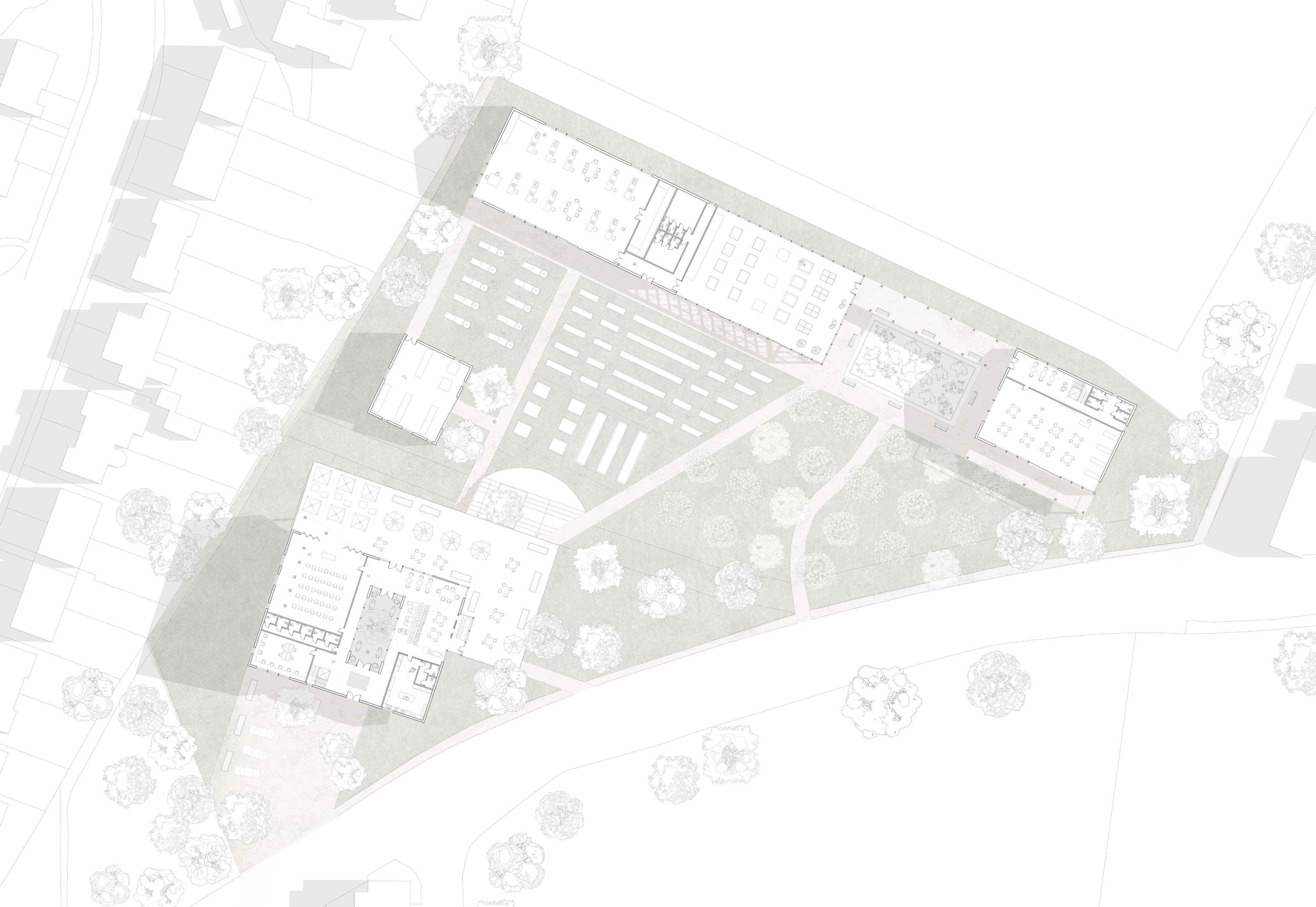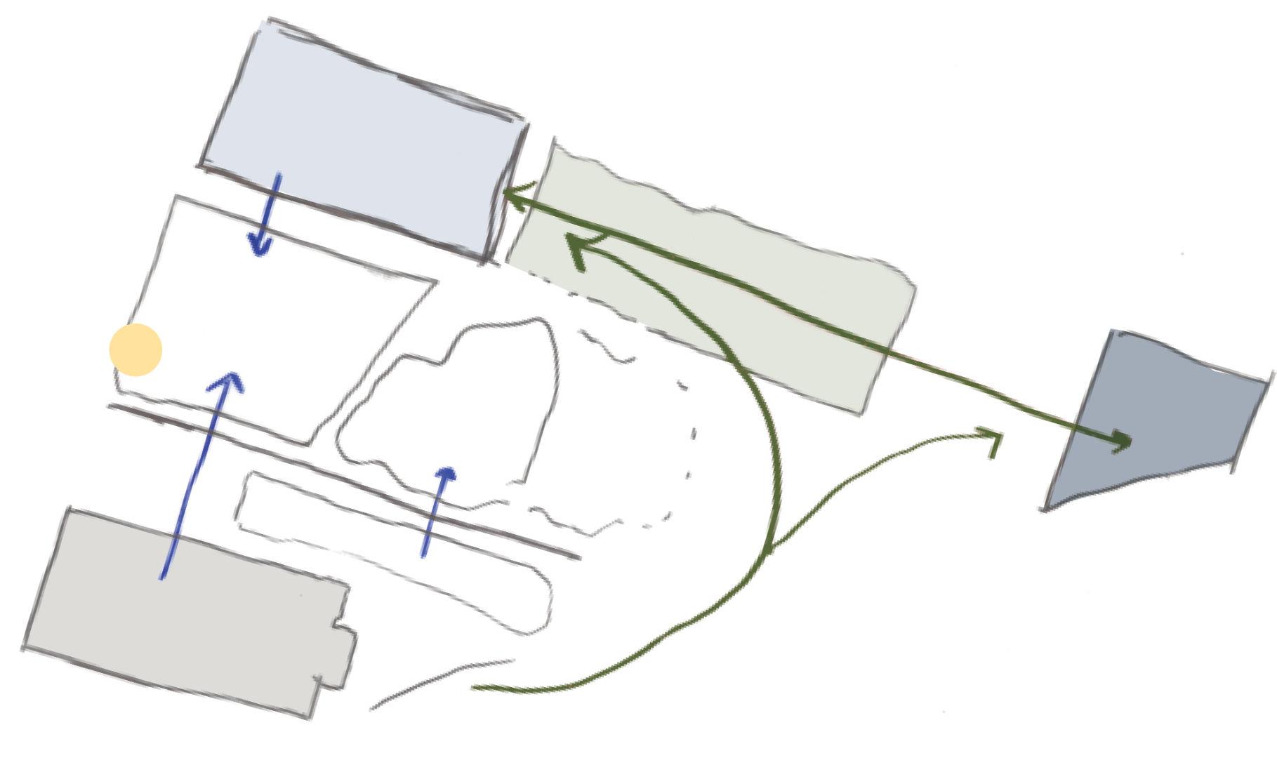 The site plan to the left shows my intentions for the site. I wanted there to be an uninterrupted visual connection to nature and for all the buildings in the scheme to overlook the outdoor growing space between them. The circulation routes emphasise this continuous journey through the natural environment.