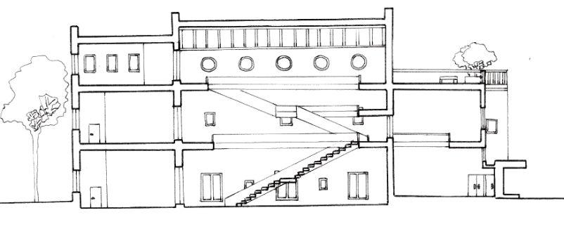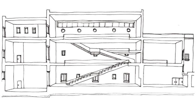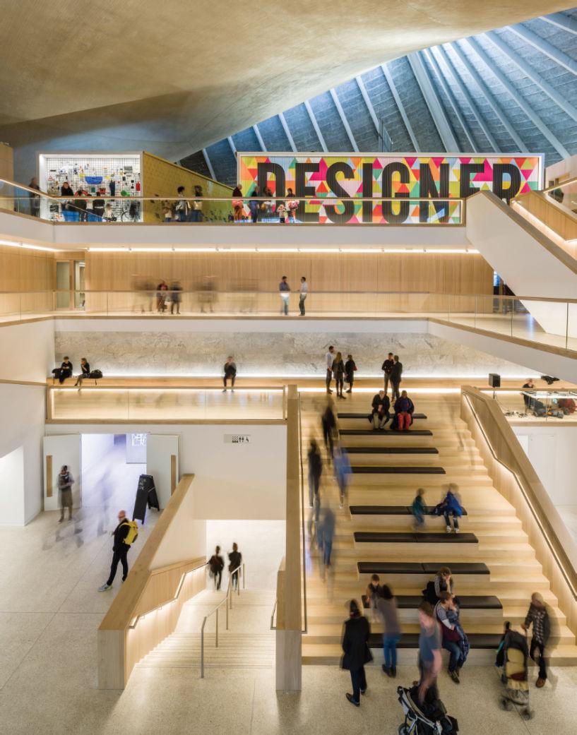 This lazy stair allows people to rest or stop and interact as they make their way through the exhibition space. Concrete columns support the ceilings around the voids in the 4 floors, creating a sense of order and hierarchy.