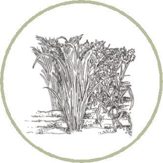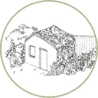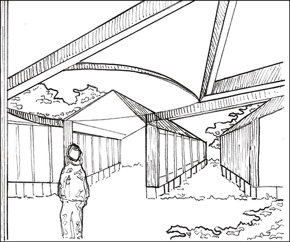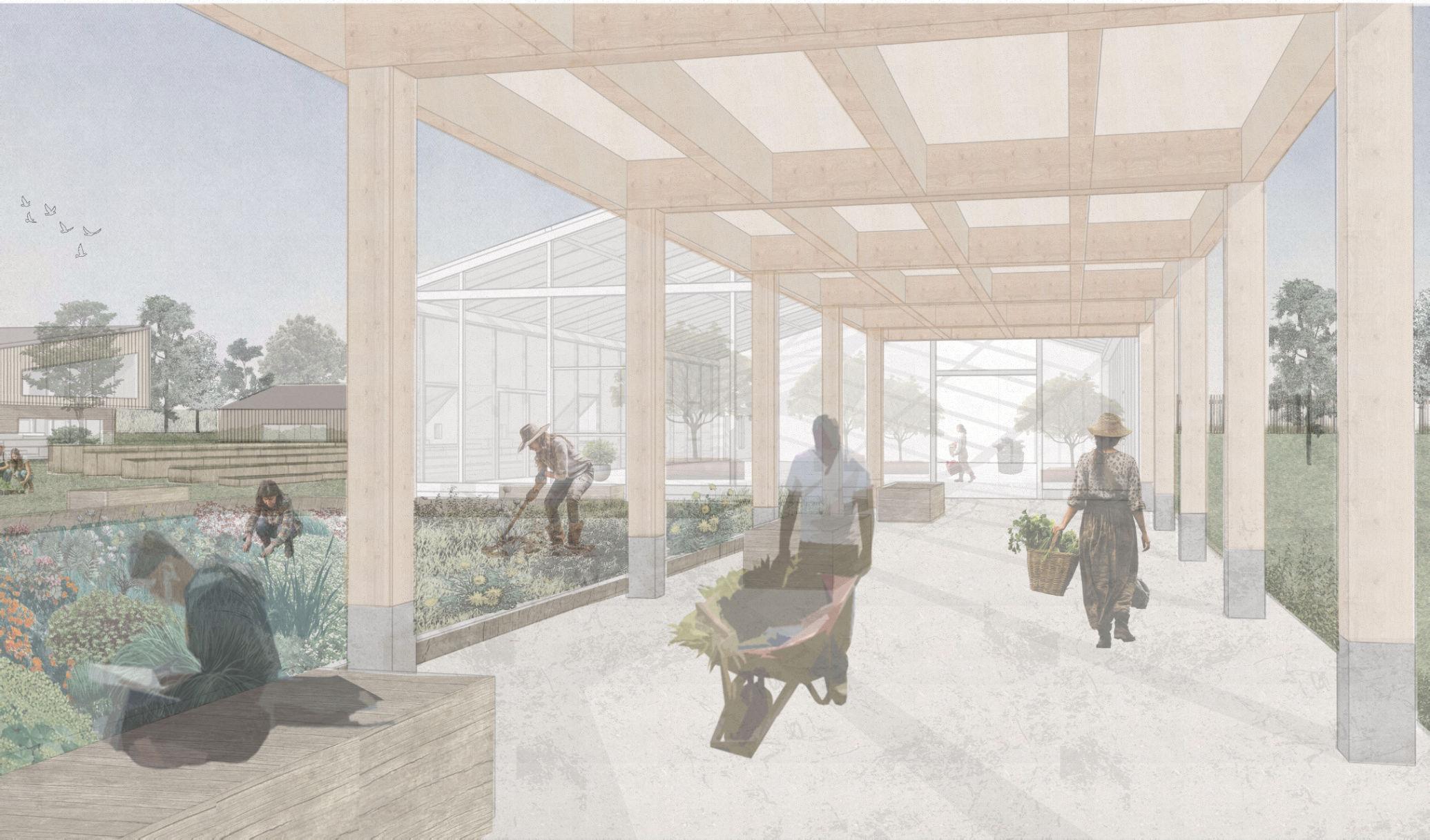 This view shows the journey between the classrooms and greenhouse building. It overlooks the outdoor growing space and wildflower garden, creating a peaceful and scenic narrative where students can take a break to socialise or rest on route to their destination.