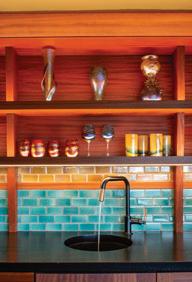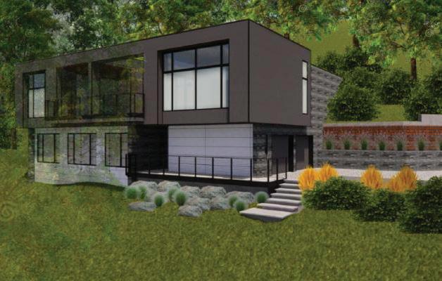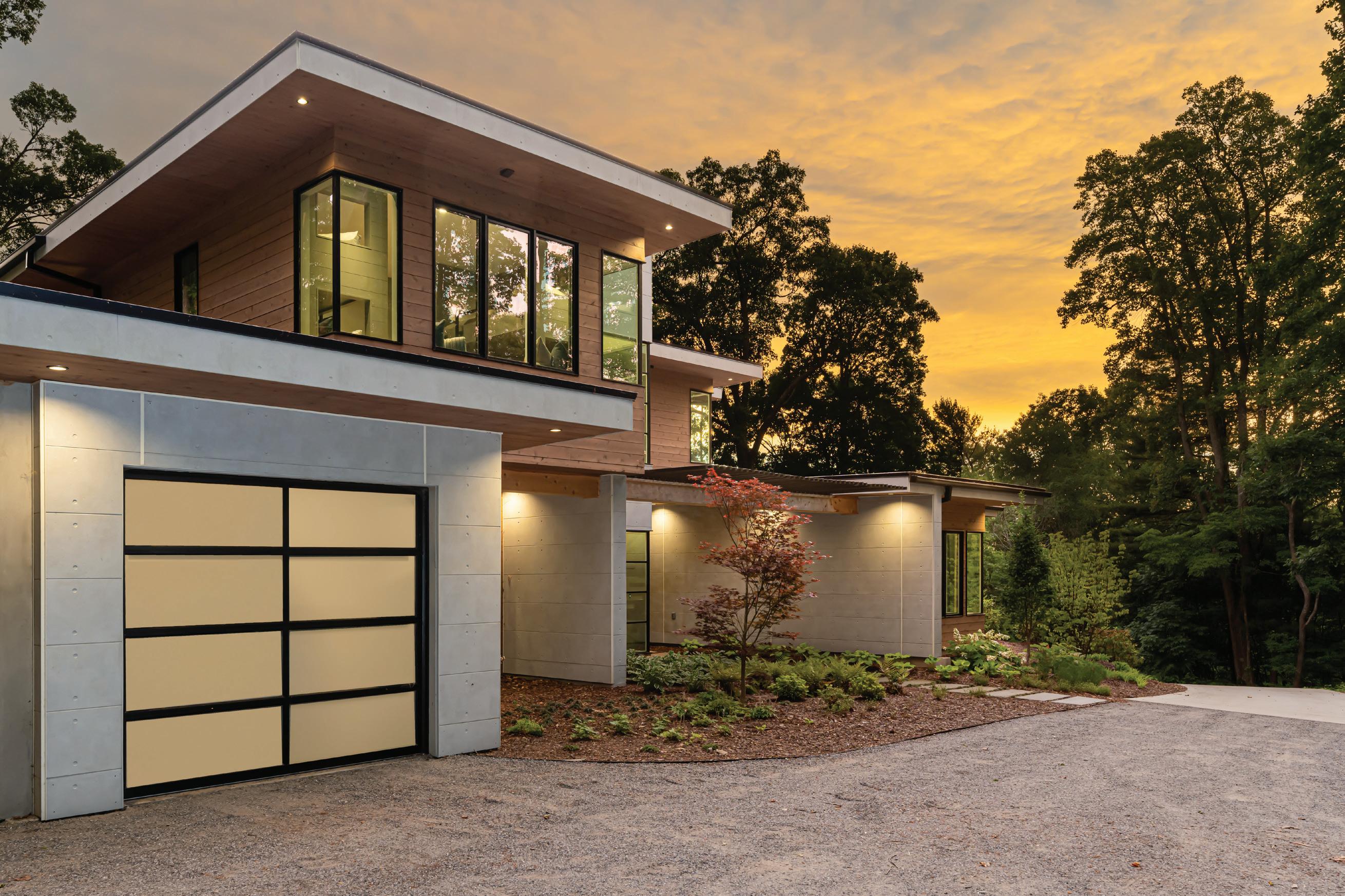 custom home designed by Rusafova Markulis Architects, features modern floor to ceiling windows, lofted living space, and a low maintenance green roof. Artisan hand painted tiles are featured in the kitchen and bathrooms. Recessed channel