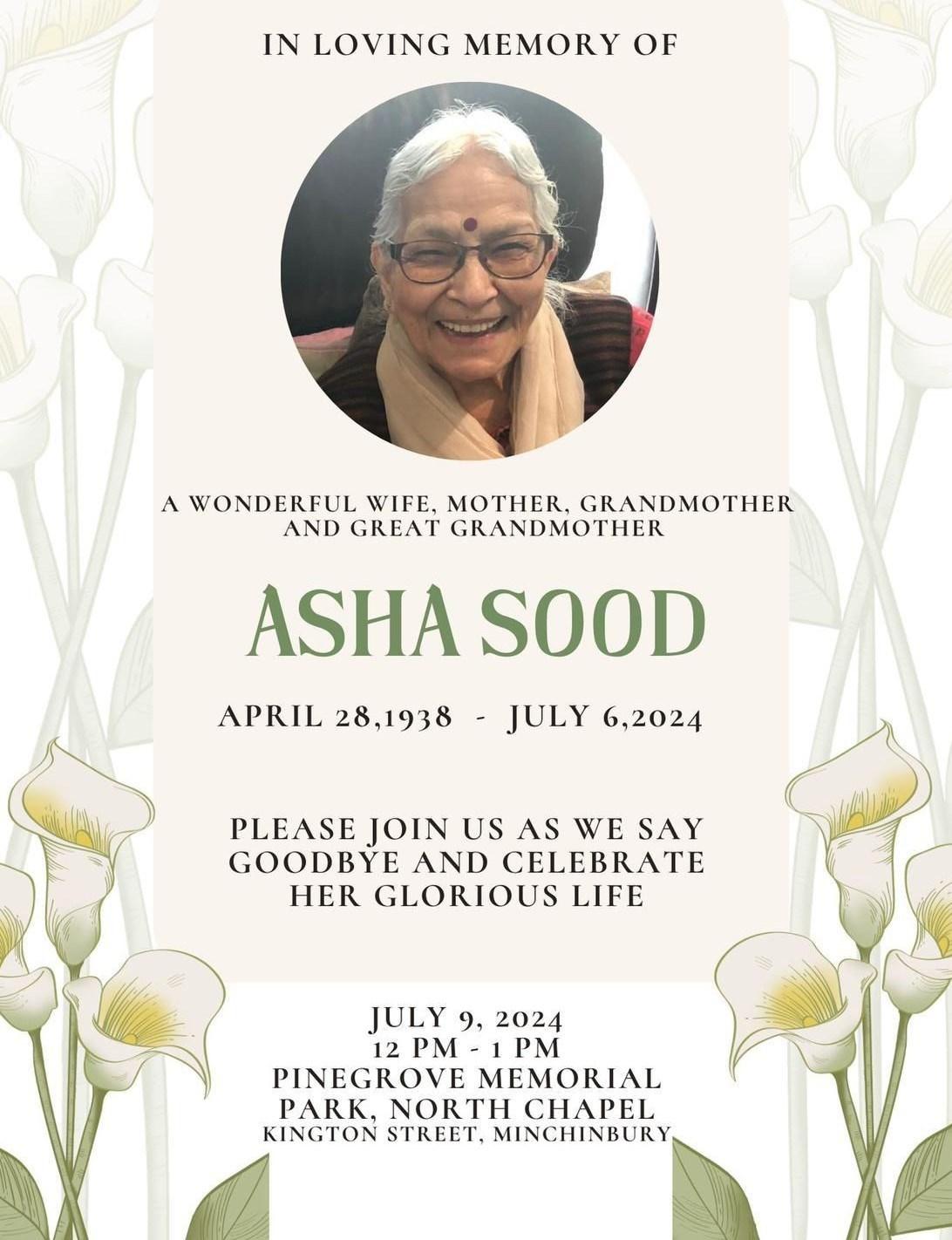 Mrs. Asha Sood, wife of Mr. Krishan Sood Ji, beloved mother, grandmother, and great-grandmother, left us for her heavenly abode on 6 July 2024. May her soul rest in peace.