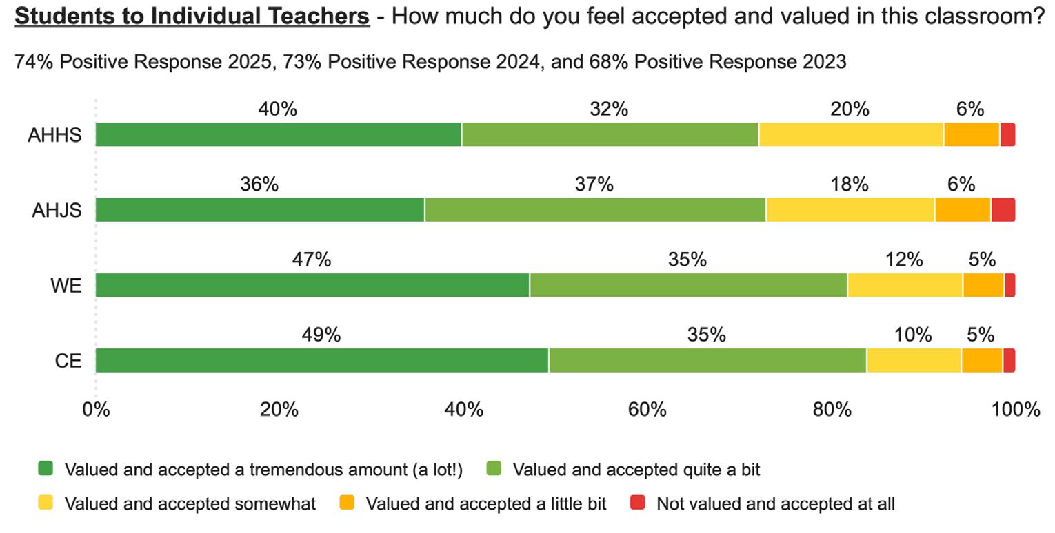 The Positive Relationships Survey was given to all students and teachers in grades 3–12 in February 2025. It measures the strength of social connections between students and teachers, both in and outside the classroom. Research shows that strong teacher-student relationships are linked to increased motivation, engagement, and persistence in learning.