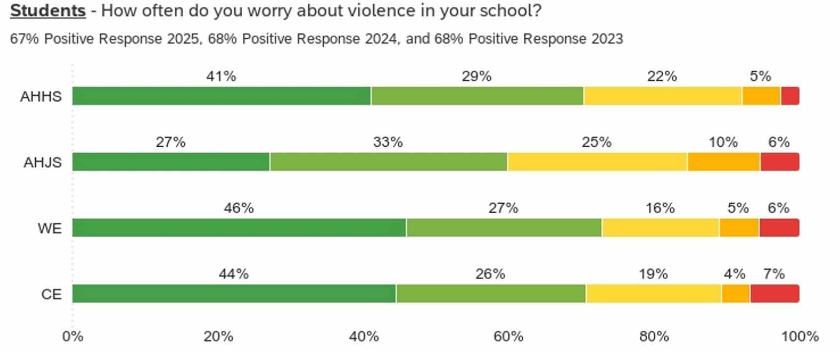Findings: Survey results show that a majority of AHISD students and parents report feeling safe at school. In fall 2024, 67% of students and 69% of parents responded positively when asked how often they worry about violence at school—indicating they “almost never” or only “once in a while” worry. While overall trends remain steady compared to previous years, perceptions of safety were especially strong at the elementary campuses, with the highest positive responses seen at Woodridge and Cambridge Elementaries. These results reflect ongoing district efforts to maintain a safe and supportive learning environment for all students.