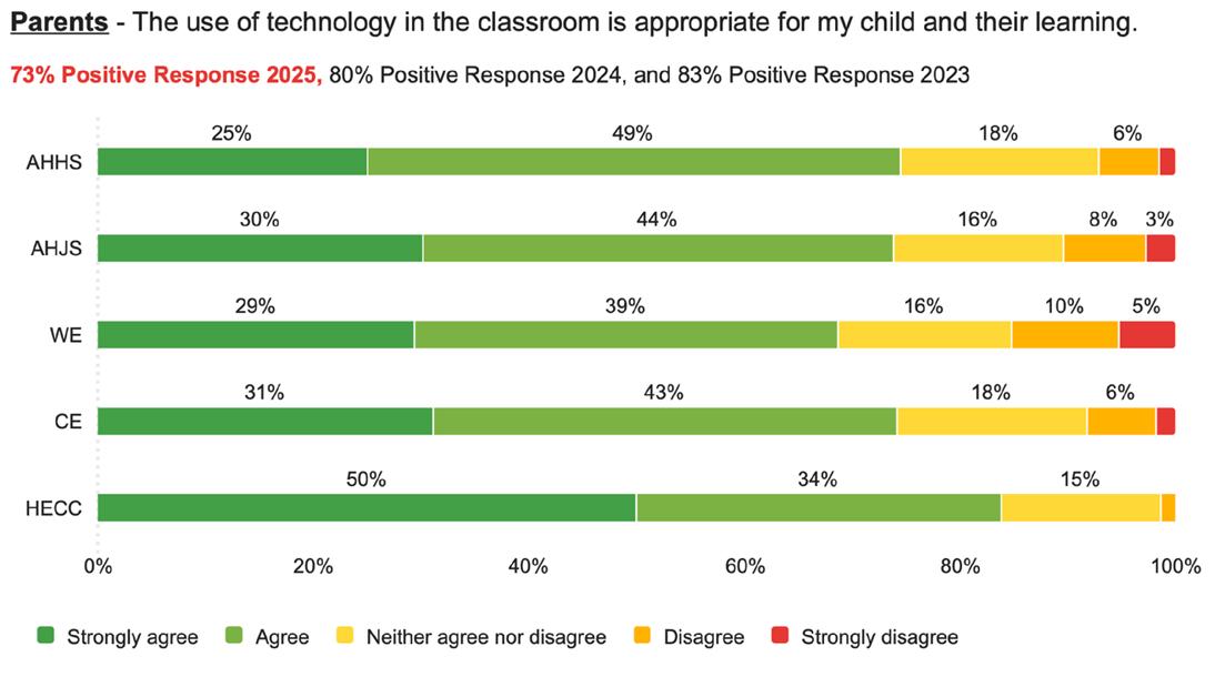 This year’s survey showed a decline in parent satisfaction with how technology is used in classrooms, dropping to 73% from 80% last year. In response, AHISD is prioritizing consistent implementation of technology guidelines across campuses and improving communication with families about how digital tools support student learning.
