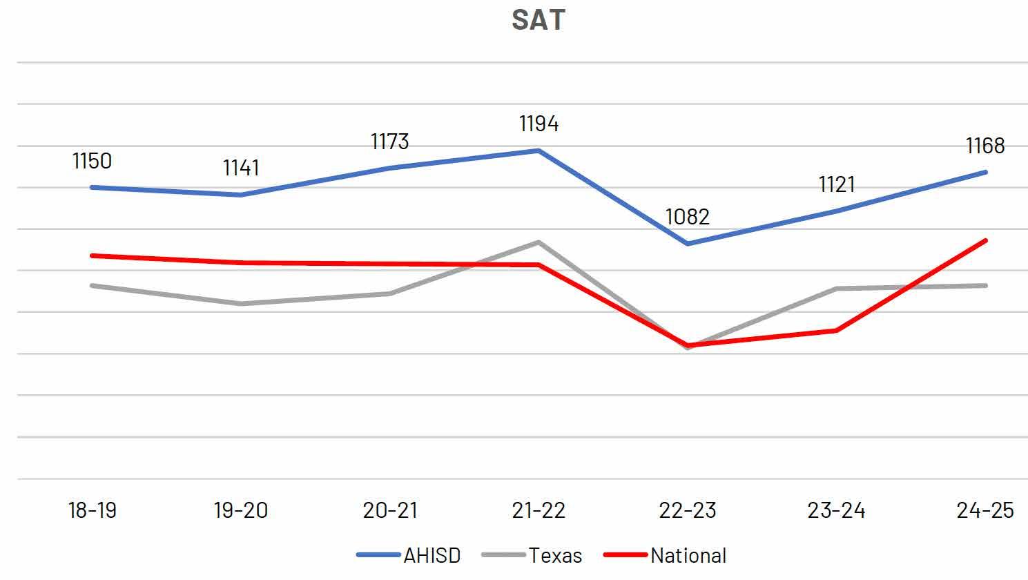 Findings: AHISD scores surpass both national and Texas comparison scores. AHISD continues to offer a free of charge School Day PSAT exam available to all students in the 11th grade in the fall.
