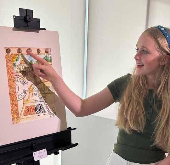 The culminating experience is an art show, highlighting student work completed during the New Heights program. Each student was tasked to create an analytique, or visual representation of a San Antonio landmark they visited on a field trip.