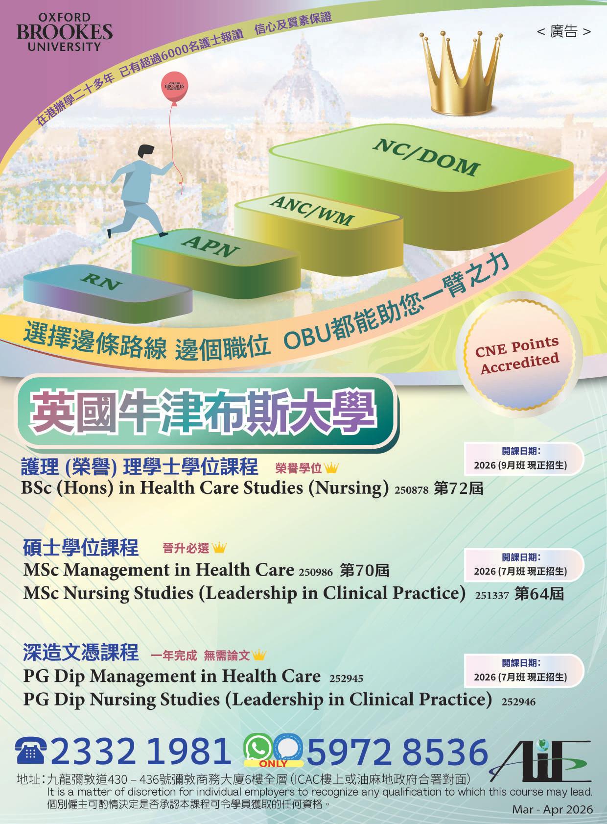 Above programmes are recognized by NCHK for Voluntary Scheme on Advanced and Specialised Nursing Practice! CNE: Total 128 Points
