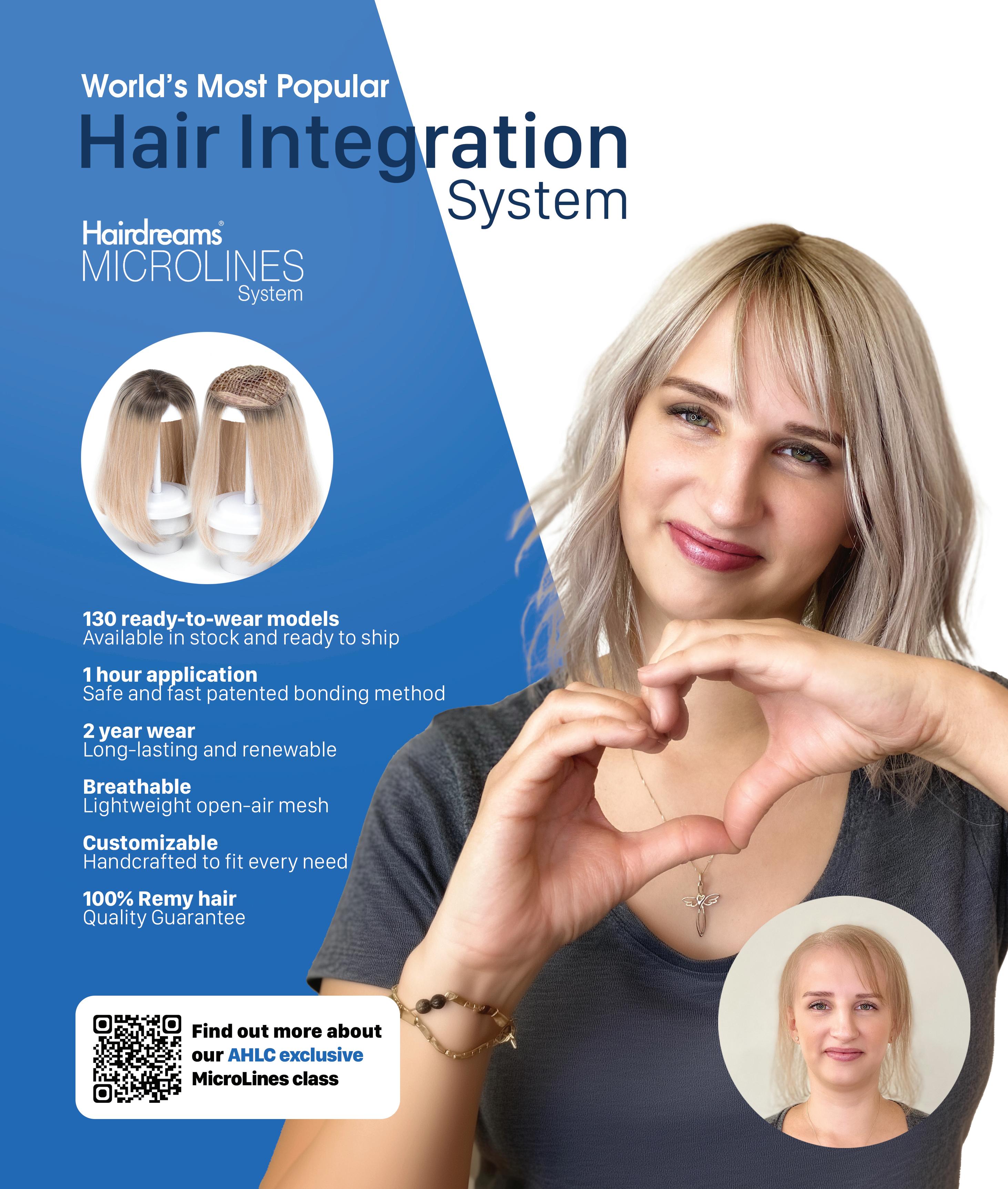 Unlock exclusive access to our tailor-made training program for AHLC members. Combine your advanced skills with our proprietary method of applying Hairdreams’ legendary MicroLines Hair Integration Toppers. Unlike with other mesh systems, the client’s hair is integrated through 100% of the MicroLines mesh for a more natural feel, look and breathability.