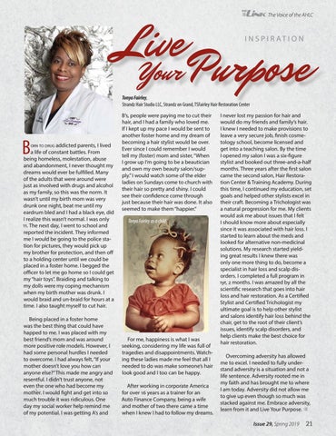 I never lost my passion for hair and would do my friends and family’s hair. I knew I needed to make provisions to leave a very secure job, finish cosmetology school, become licensed and get into a teaching salon. By the time I opened my salon I was a six-figure stylist and booked out three-and-a-half months. Three years after the first salon came the second salon, Hair Restoration Center & Training Academy. During this time, I continued my education, set goals and helped other stylists excel in their craft. Becoming a Trichologist was a natural progression for me. My clients would ask me about issues that I felt I should know more about especially since it was associated with hair loss. I started to learn about the meds and looked for alternative non-medicinal solutions. My research started yielding great results I knew there was only one more thing to do, become a specialist in hair loss and scalp disorders. I completed a full program in 1yr, 2 months. I was amazed by all the scientific research that goes into hair loss and hair restoration. As a Certified Stylist and Certified Trichologist my ultimate goal is to help other stylist and salons identify hair loss behind the chair, get to the root of their client’s issues, identify scalp disorders, and help clients make the best choice for hair restoration. Overcoming adversity has allowed me to excel. I needed to fully understand adversity is a situation and not a life sentence. Adversity rooted me in my faith and has brought me to where I am today. Adversity did not allow me to give up even though so much was stacked against me. Embrace adversity, learn from it and Live Your Purpose. Issue 29, Spring 2019