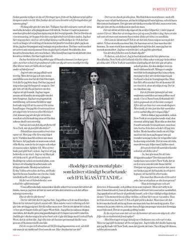 PORTRÄTTET –Det var en chock på alla plan. Med kärleken man känner, med allt. Jag var van vid att ha klarsyn, att ha fri tillgång till min hjärna, och ett barn blir som en hackspett. Det går inte att tänka en tanke till slut, man sover inte, det går inte att ha en diskussion med sin man. Det var skönt att höra dig säga att du avskyr lekparker, i intervjupodcasten Värvet. Man har så stränga krav på sig som förälder i dag, bara en sån sak som att man som mamma bara måste älska att sitta i en sandlåda. –Det som är skönt med USA är att det inte finns någon norm på det sättet. Vi har så starka normer här, för hur man ser ut, hur man har det hemma. Är man stark kan man koppla bort sig från det, men jag har en svensk mentalitet. Jag har svårt för det, och jag blir påverkad. Var det den friheten som lockade dig dit? –Friheten, och drivet. Jag är bortskämd med de här platserna. Stockholm, New York och Gotland står för olika saker som jag värdesätter på olika sätt. I New York är samtiden så påtaglig att det inte går att göra avkall på den, för den sköljer över en med våldsam kraft. Många vi umgås med där är framgångsrika i sina yrken, men jag tycker att värderingarna på Gotland också är framgångsrika. Man har fått offra mycket för att komma till en viss nivå, utan att sälja ut sig. Det är en rikedom i sig. Det är förstås tjänstefel att inte omfamna samtiden om man jobbar med mode. Coco Chanel som förkastade 60talets popmode är ett berömt exempel. Efter det var hon över som modeskapare. Men ändå, är inte just den här samtiden extra outhärdlig att tvingas följa? –Delvis älskar jag samtiden, också. New York är en så pulserande stad, den stannar aldrig upp. Man slås av den här framfrustande livsmaskinen, man kan inte bortse från den och det vill jag inte heller. Mode handlar ändå om att följa med sin tid, men jag hoppar inte på trender som jag tycker är tröga eller inte lockar mig estetiskt. Det är som att rida, man driver på, följer med, håller emot. Att vara kritisk till samtiden kanske också är att delta i den? – Ja, hur gör man för att inte ifrågasätta saker? Det här med eftertanke kan vara svårt i New York, det är en lyxvara som det inte finns tid för. I början var jag provocerad av det, men nu tänker jag att det kanske är ett privilegium: att ha tid för eftertanke. Din man har liksom du ett kreativt yrke, har ni ett utbyte av det även privat? –Han är formgivare och art director, frilansande, och jobbar även som regissör. Men vårt utbyte är inte främst kreativt, han är dock påläst och brett intresserad av samhället. Jag uppskattar att han är så politiskt insatt, och vi har väldigt roliga diskussioner. Vi kommer från så olika världar, och har lärt oss av varandra. Han är från storstan, har bott i USA och gått på bra skolor. Man inser att det krävs mycket kraft att ta sig fram om man inte har det med sig gratis. Existensen är ju inte rättvis, och inte bara ifråga om pengar utan den förmåga man föds med. Det är en ganska jobbig insikt. Är du en person som inte vet var du kommer att vara om några år, eller följer du en stalinistisk femårsplan? –Med företaget vet jag i detalj var vi befinner oss, och vart vi ska. Men var jag själv kommer att bo vet jag inte. Jag trodde det skulle lugna sig när jag flyttade till New York, men det gjorde det inte. Nu vill jag till öknen, och bo på en ranch. Foto Rebecca Palmér