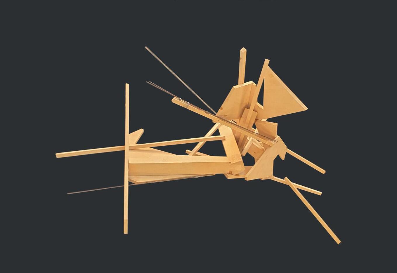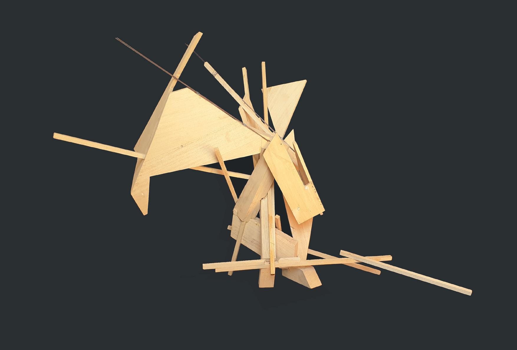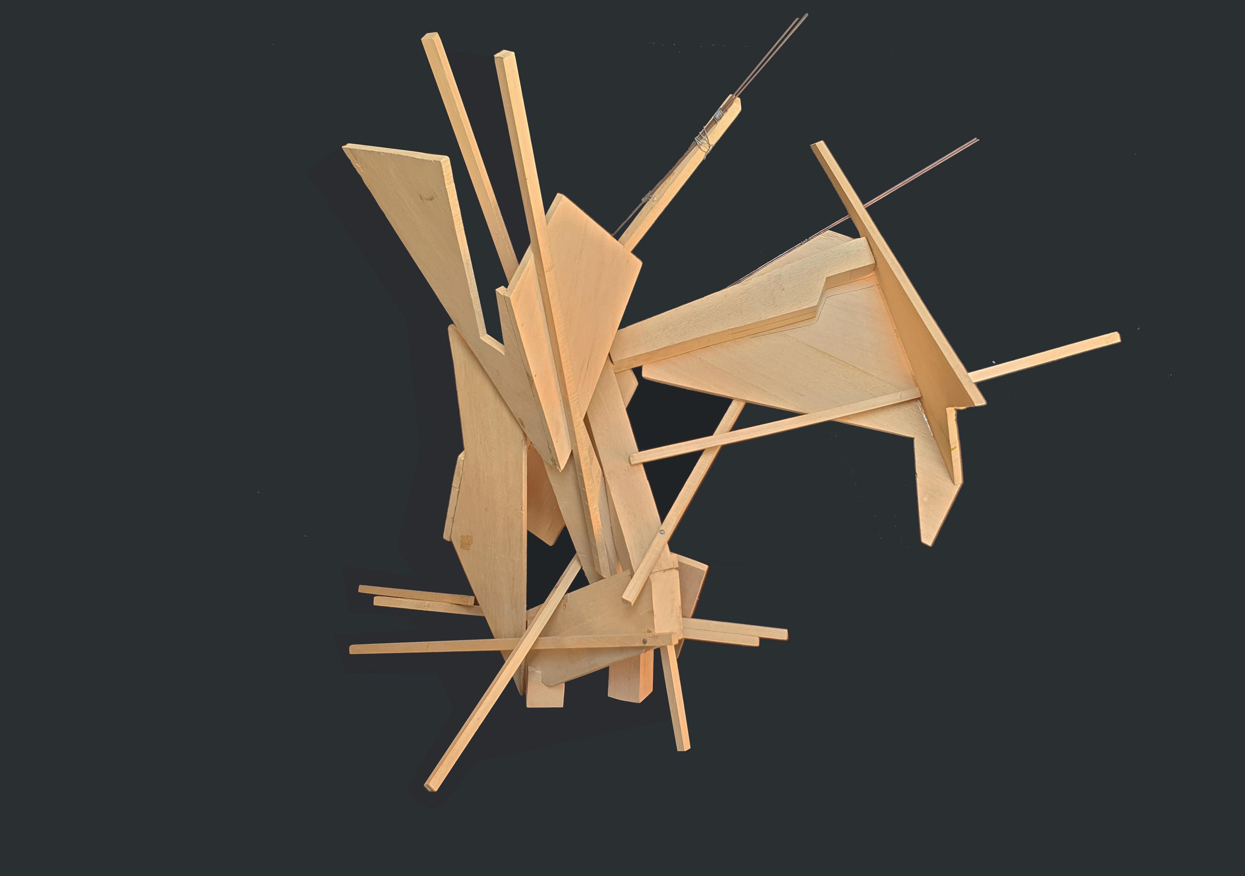 Projectile is a formal exploration in 3d manipulation, sculpture, and woodwork. It is driven by a curiosity to unravel the ambiguity born from the duality of meaning, as well as the paradoxes and bewilderment that emerge from contradictions. The project immerses itself in military strategy, an act that in essence is an exercise of ethical and moral vagueness and ambiguity. Drawing inspiration from weapons, projectiles, and their physical trajectory in space the sculpture aims at encapsulating both sides, the offensive aggression and the defensive reactionary protection and fear, hence it cultivates formal and conceptual confusing, inviting the viewers to navigate to navigate the intricate interplay of conflicting ideas and emotions.