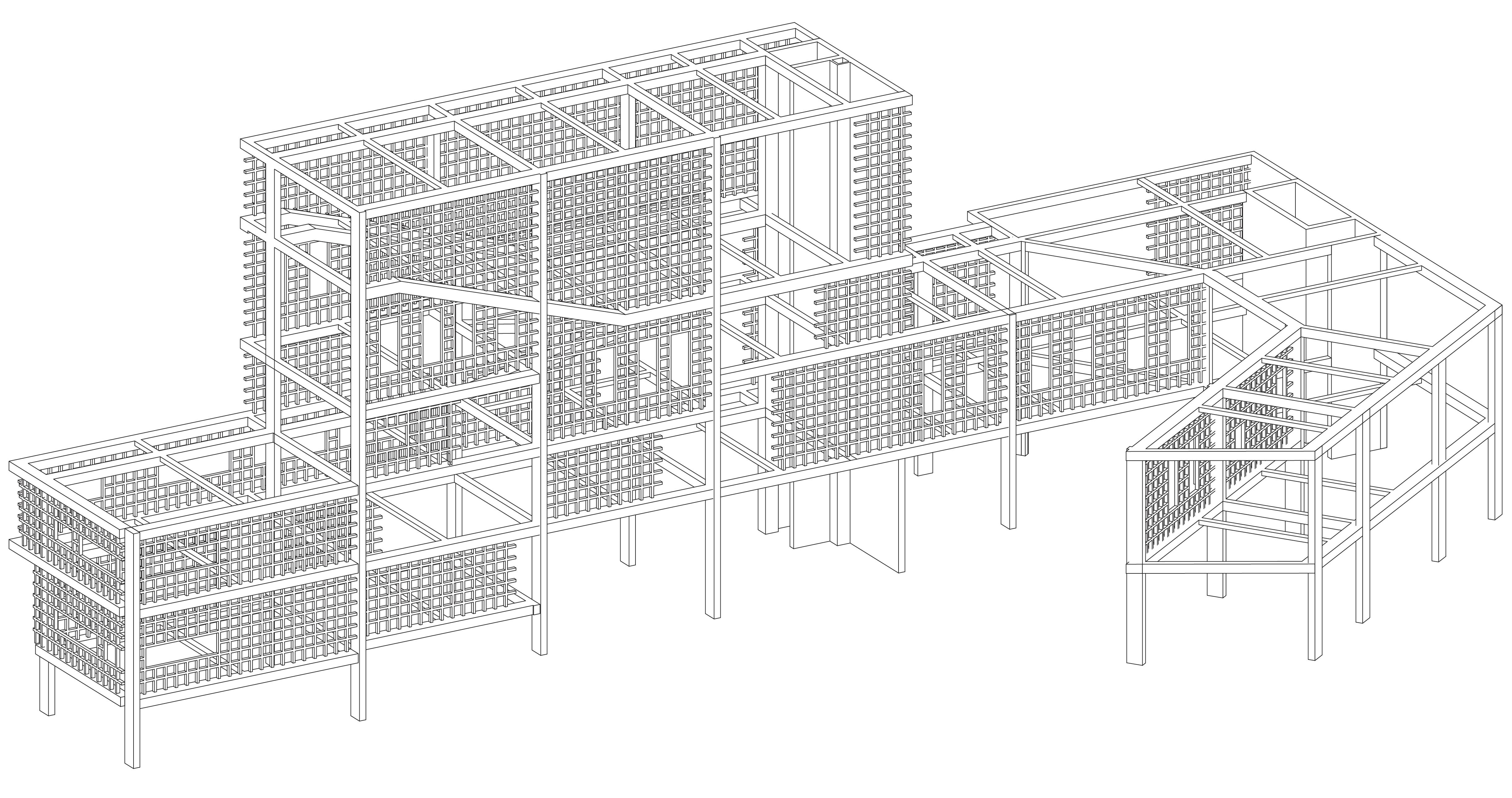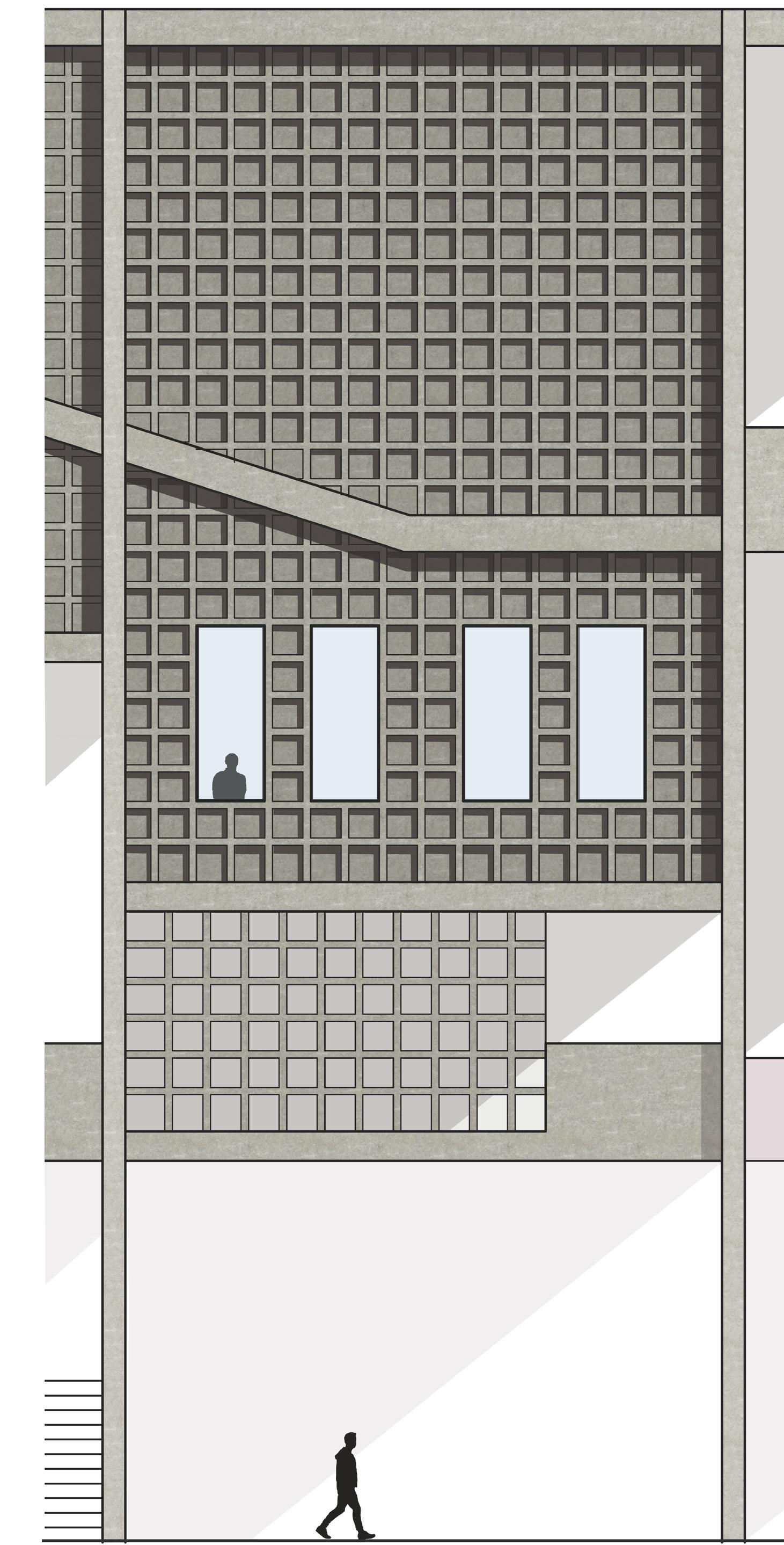 community activity to continue occurring. The final form stems from the existing density and surrounding mass-void composition. The circulation was conceived as an extension to the alleys and streets of the neighborhood, punctured by both vertical voids and horizontal opening to ensure continuity and unity between different levels and the surrounding. The varied floor plans and functions are homogenized by engulfing the structure with a claustra, that does not overwhelm the continuity or dynamism in the building or surrounding. Hence the claustra is both a physical and symbolic conception of the architecture.