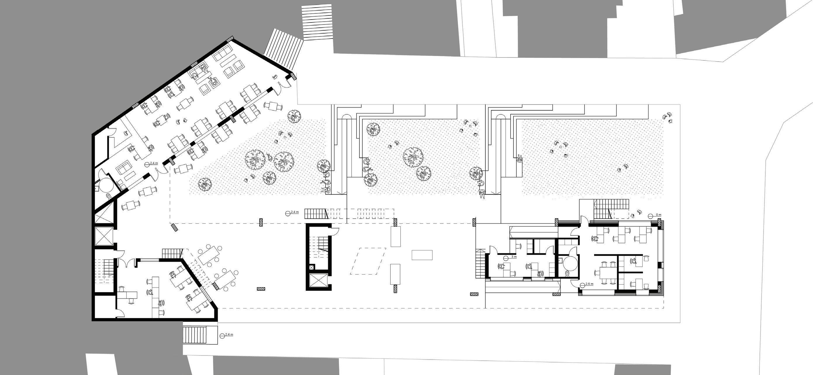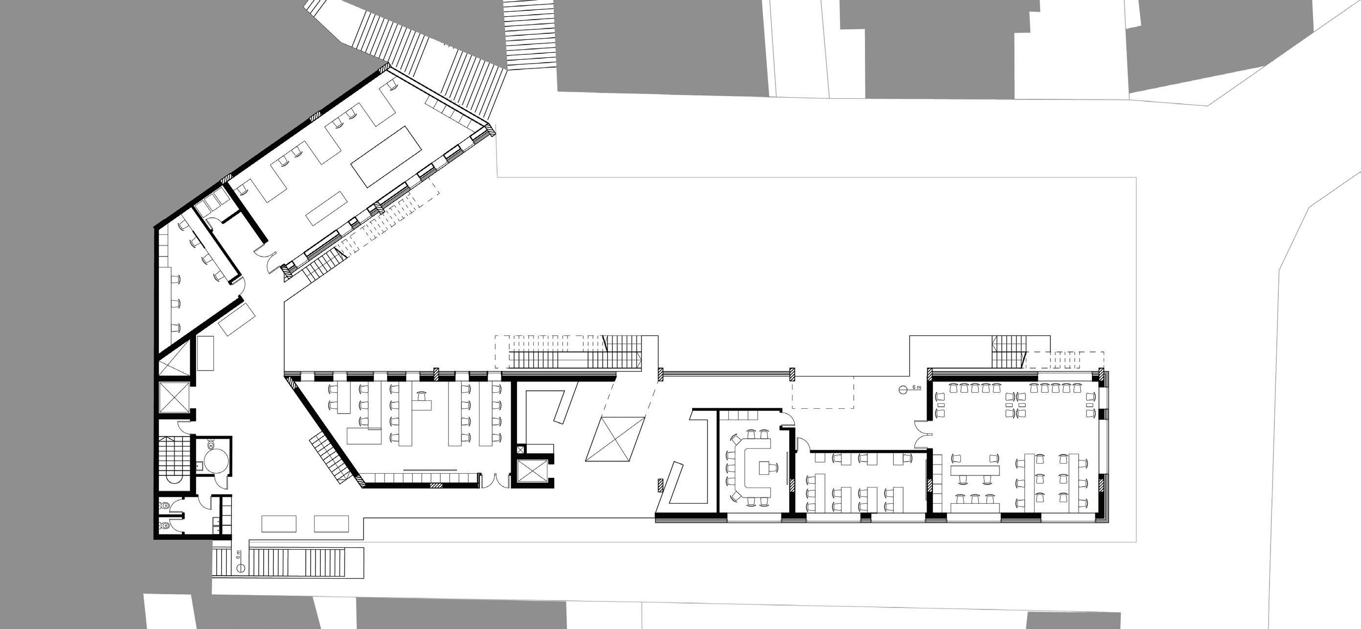 Constructing on this specific vacant plot was a dilemma, as the plot acted as an informal common ground for the community, functioning as a public park or plaza, in addition, the surrounding buildings are strategical oriented towards the plot. Hence from the head start maintaining these communal and void characteristics was a propriety.