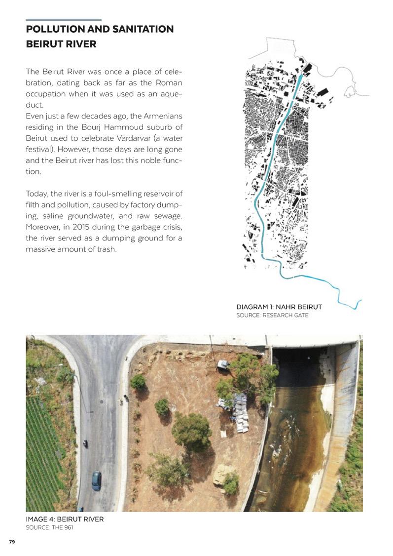 The project addresses water scarcity in Beirut by implementing an irrigation system with exposed channels, filtration gardens, and rainwater collection, creating a closed-loop system to alleviate water scarcity and revitalize the waterfront.